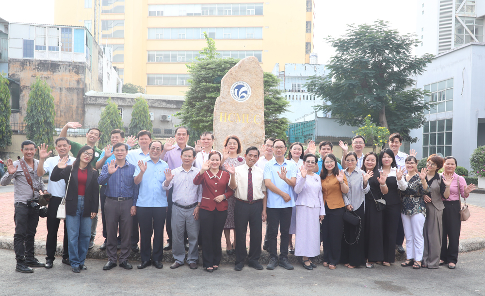 Các đại biểu chụp ảnh lưu niệm bên Cụm đá biểu tượng - ghi dấu khoảnh khắc ý nghĩa trong hành trình 50 năm hình thành và phát triển của HCMUC.