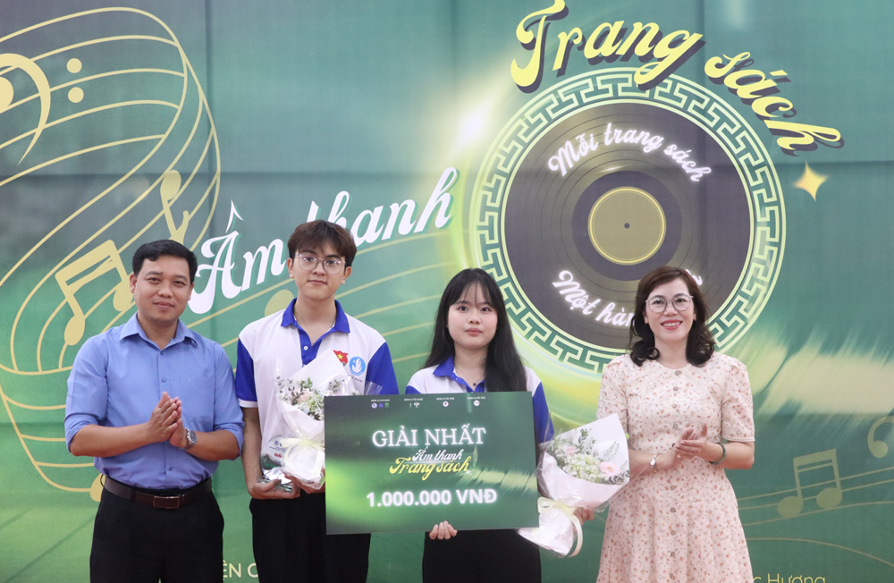Đại diện Trung tâm Thông tin, Thư viện và Khoa Quản lý văn hóa, nghệ thuật trao Giải Nhất cuộc thi “Âm thanh trang sách” cho 2 thí sinh Phạm Thảo My và Huỳnh Thanh Lộc, sinh viên Khoa Văn hoá và Truyền thông, ghi nhận những sản phẩm audio sáng tạo của sinh viên.