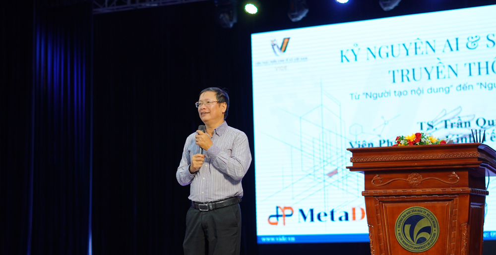 Tại chương trình, TS. Trần Quý, Viện trưởng Viện Phát triển Kinh tế Số Việt Nam đã mang đến tham luận “AI trong bối cảnh truyền thông số: xu hướng, tác động và năng lực tương lai của người làm truyền thông”. Bài trình bày đã phác họa bức tranh tổng thể về sự dịch chuyển của ngành truyền thông dưới tác động của AI, từ công cụ hỗ trợ sang tái cấu trúc mô hình nghề nghiệp. Theo ông, AI đang tạo ra những chuẩn năng lực mới, buộc người làm truyền thông phải chuyển từ “biết sử dụng công cụ” sang “làm chủ tư duy sáng tạo và chiến lược nội dung”. Trong đó, các giá trị cốt lõi như tư duy văn hóa, khả năng kể chuyện, cảm quan thẩm mỹ và đạo đức nghề nghiệp vẫn là những yếu tố mà AI khó có thể thay thế.