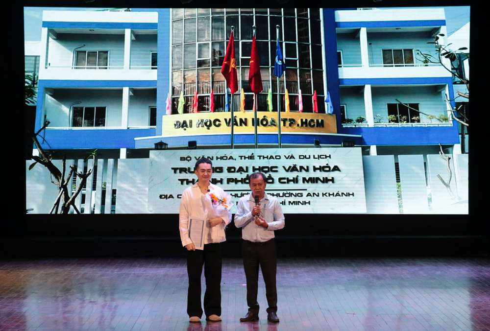TS. Nguyễn Đức Tuấn, Phó Trưởng khoa, Điều hành Khoa Văn hóa và Truyền thông trao thư và hoa tri ân đại diện Công ty TNHH TMDV Tina Entertaiment đã tài trợ 10 suất học bỗng trị giá 50 triệu đồng cho sinh viên của khoa.