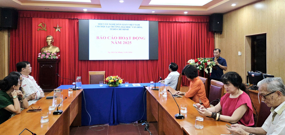 VHSO - Chiều ngày 31/01, tại Phòng Hội thảo (cơ sở 1), Trường Đại học Văn hóa TP. Hồ Chí Minh (HCMUC), Chi hội Văn nghệ Dân gian Việt Nam tại HCMUC đã tổ chức buổi họp mặt tổng kết hoạt động năm 2025, triển khai phương hướng nhiệm vụ năm 2026 và trao quyết định kết nạp hội viên mới. Đây không chỉ là dịp nhìn lại chặng đường hoạt động chuyên môn trong năm qua mà còn là không gian kết nối học thuật, chia sẻ định hướng nghiên cứu và lan tỏa giá trị văn hóa dân gian trong môi trường đào tạo đại học.