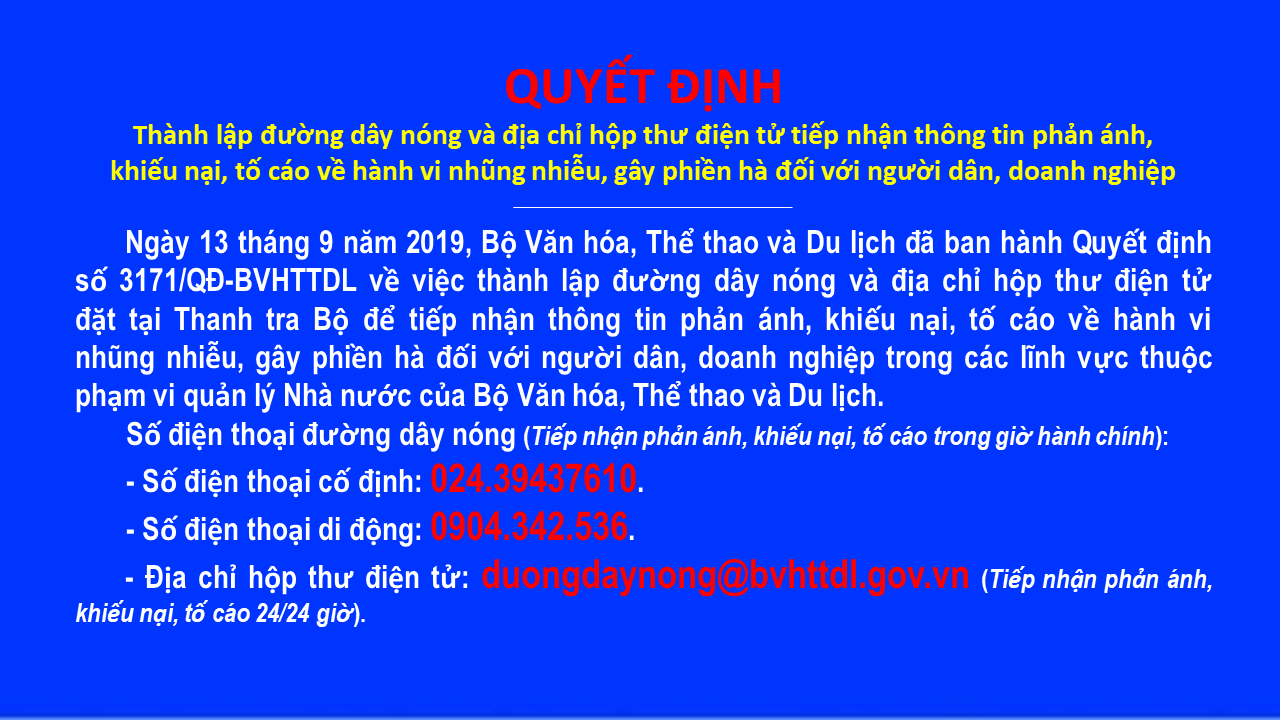 25 Oct Đường dây nóng tiếp nhận phản ánh, khiếu nại, tố cáo của Bộ Văn hóa, Thể thao và Du lịch. Nguyễn Hải Gian 6453 Xem Share: