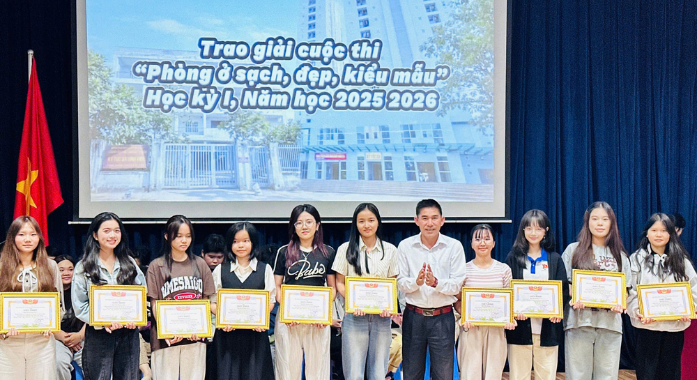 Trong khuôn khổ buổi giao ban, Phòng Công tác Sinh viên cũng đã công bố kết quả cuộc thi “Phòng ở sạch - đẹp - kiểu mẫu tại ký túc xá trong năm học 2025 - 2026”. Hoạt động này nhằm khuyến khích sinh viên nâng cao ý thức giữ gìn vệ sinh môi trường sống, xây dựng không gian sinh hoạt gọn gàng, ngăn nắp và văn minh. Kết quả, Ban Tổ chức đã trao: 01 giải Nhất; 02 giải Nhì; 02 giải Ba và 28 giải Khuyến khích. Bên cạnh đó, 07 sinh viên có nhiều đóng góp tích cực trong công tác tự quản phòng và xây dựng nếp sống ký túc xá cũng được tuyên dương, khen thưởng.