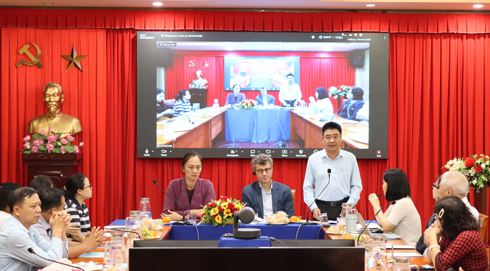 Ông Jonathan Baker (giữa), Trưởng đại diện Văn phòng UNESCO tại Hà Nội; PGS.TS Lâm Nhân, Hiệu trưởng HCMUC và bà Phạm Thị Thanh Hường, Trưởng Ban Văn hóa, Văn phòng UNESCO tại Hà Nội chủ trì buổi họp.