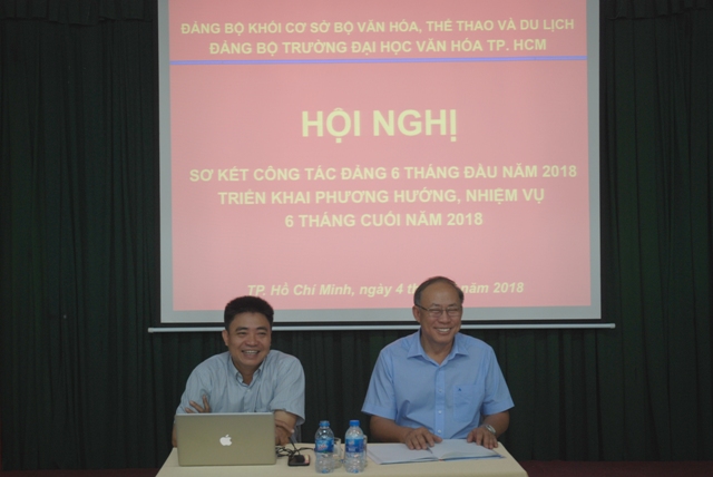Sáng ngày 04 tháng 07 năm 2018 tại Hội trường B201, Đảng ủy Trường Đại học Văn hóa TP. Hồ Chí Minh tổ chức “Hội nghị sơ kết công tác xây dựng Đảng 06 tháng đầu năm 2018 và triển khai nhiệm vụ công tác 06 tháng cuối năm 2018”. Đến dự Hội nghị có Đ/c Nguyễn Thế Dũng - UVBTV Đảng ủy Khối, Bí thư Đảng ủy; Đ/c Lâm Nhân – Phó Bí thư Đảng ủy; cùng toàn thể các đồng chí là Đảng ủy viên, Bí thư, Phó Bí thư, cấp ủy các chi bộ trực thuộc, các đồng chí đảng viên của Đảng bộ Trường Đại học Văn hóa TP. Hồ Chí Minh.