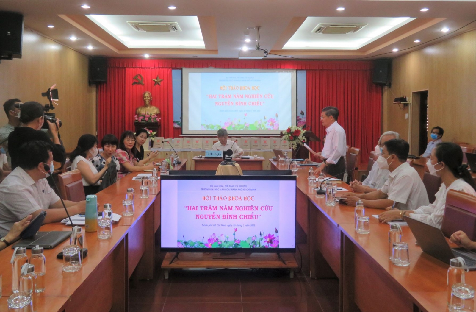 Trong khuôn khổ thực hiện đề tài nghiên cứu khoa học tỉnh Bến Tre, theo Quyết định số 3010/QĐ-UBND ngày 27/12/2021 của Chủ tịch Ủy ban Nhân dân tỉnh Bến Tre về việc thực hiện đề tài “Sưu tầm và số hóa các công trình nghiên cứu về nhà thơ, nhà văn hóa Nguyễn Đình Chiểu”. Chiều ngày 25 tháng 03 năm 2022, Trường Đại học Văn hóa TP. HCM phối hợp với Sở Khoa học và Công nghệ tỉnh Bến Tre tổ chức Hội thảo khoa học “Hai trăm năm nghiên cứu Nguyễn Đình Chiểu”. Hội thảo được tổ chức trực tiếp và trực tuyến trên nền tảng webinar dưới sự chủ trì của GS.TS. Nguyễn Chí Bền.