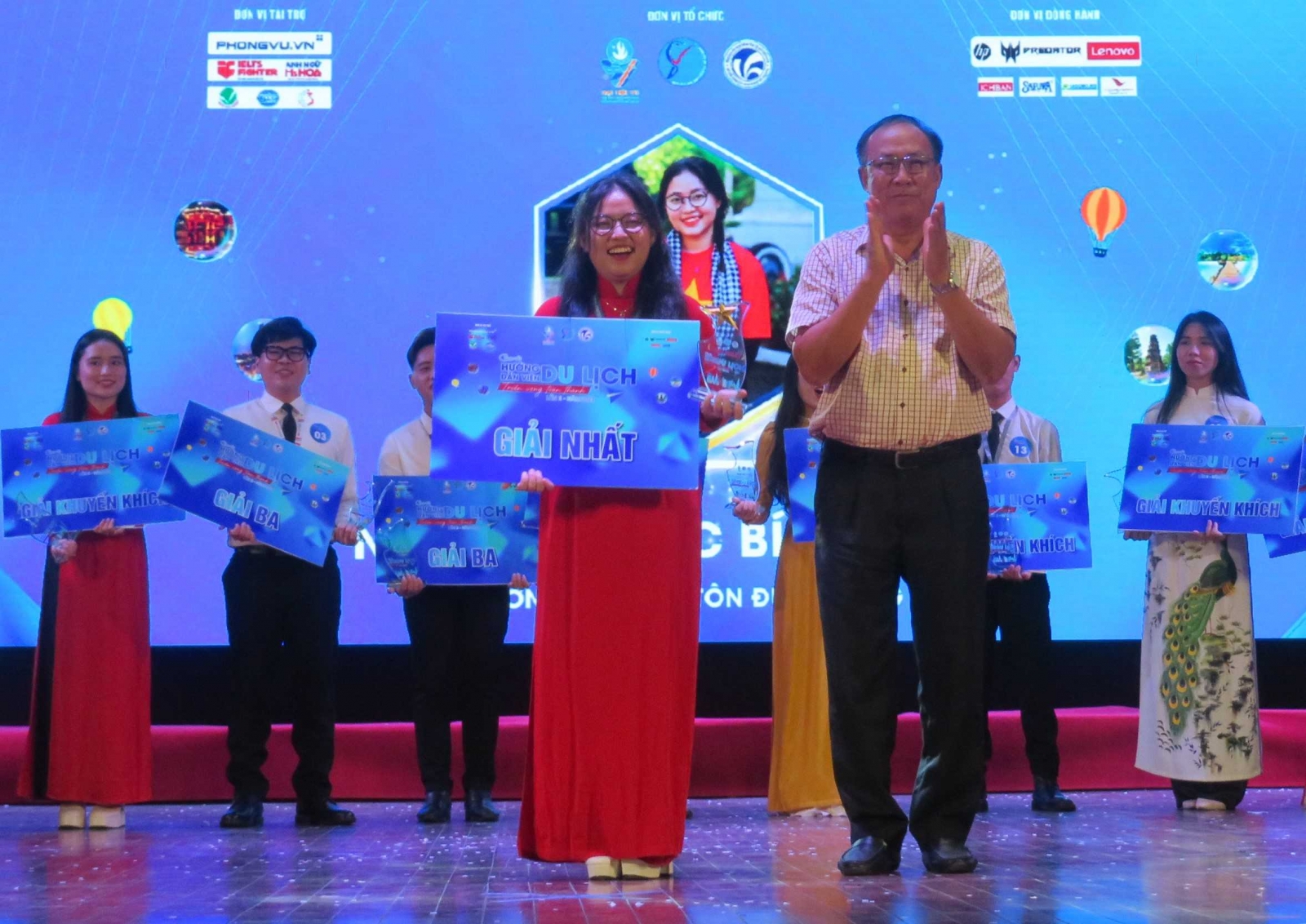 PGS.TS. Nguyễn Thế Dũng, Nguyên Hiệu trưởng Trường Đại học Văn hóa TP. Hồ Chí Minh trao Giải Nhất Cuộc thi “Hướng dẫn viên du lịch triển vọng toàn thành lần II - Năm 2023” cho thí sinh Nguyễn Ngọc Bích Loan, sinh vên Trường Đại học Tôn Đức Thắng.