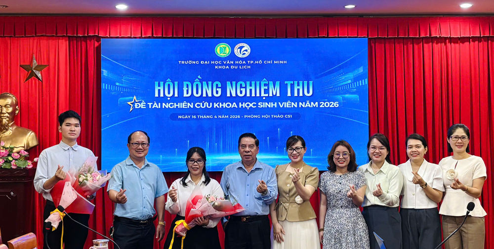 VHSO - Hoạt động nghiên cứu khoa học sinh viên tiếp tục ghi dấu ấn tại Trường Đại học Văn hóa TP. Hồ Chí Minh khi Khoa Du lịch vừa tổ chức nghiệm thu thành công các đề tài nghiên cứu khoa học sinh viên năm 2025 vào ngày 16/4 tại Cơ sở 1. Buổi nghiệm thu diễn ra trong không khí nghiêm túc, khoa học với sự tham gia của các hội đồng chuyên môn là những giảng viên, nhà nghiên cứu giàu kinh nghiệm trong lĩnh vực du lịch, quản trị lữ hành và văn hóa du lịch. Đây không chỉ là dịp đánh giá kết quả nghiên cứu mà còn là cơ hội để sinh viên thể hiện tư duy học thuật và khả năng vận dụng kiến thức vào thực tiễn.