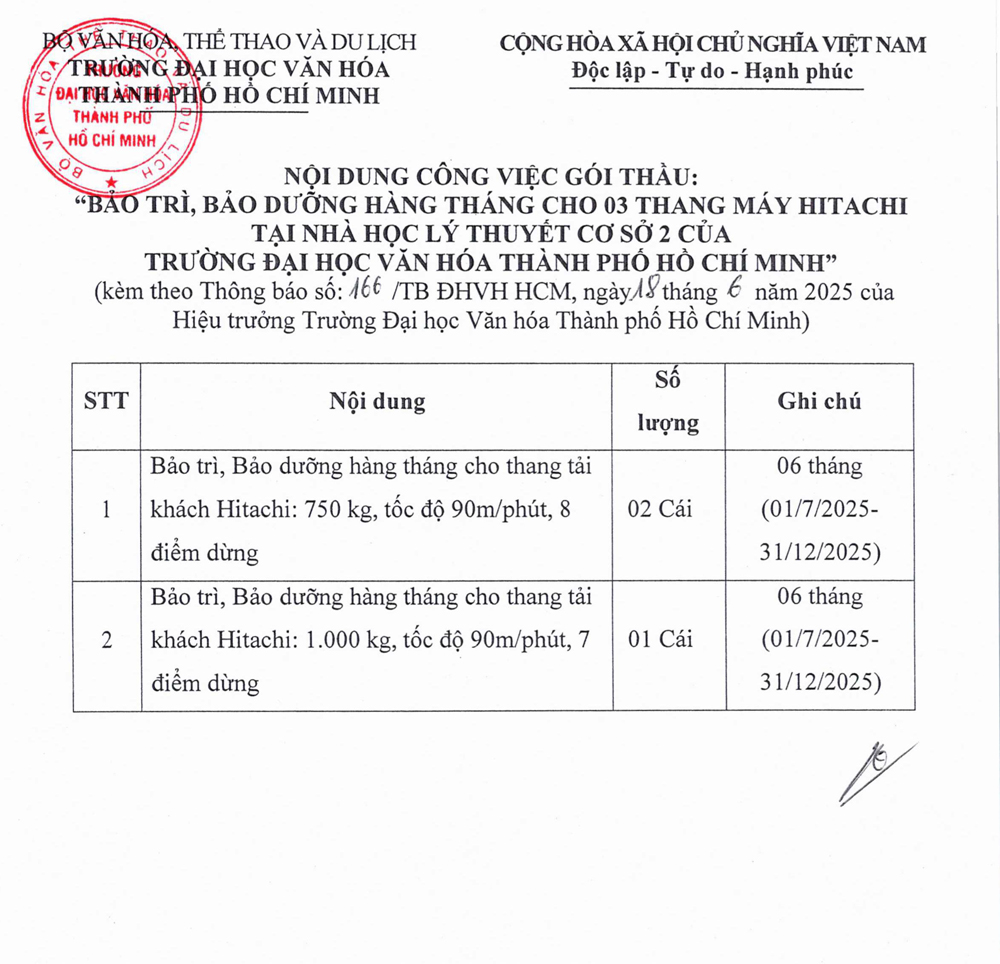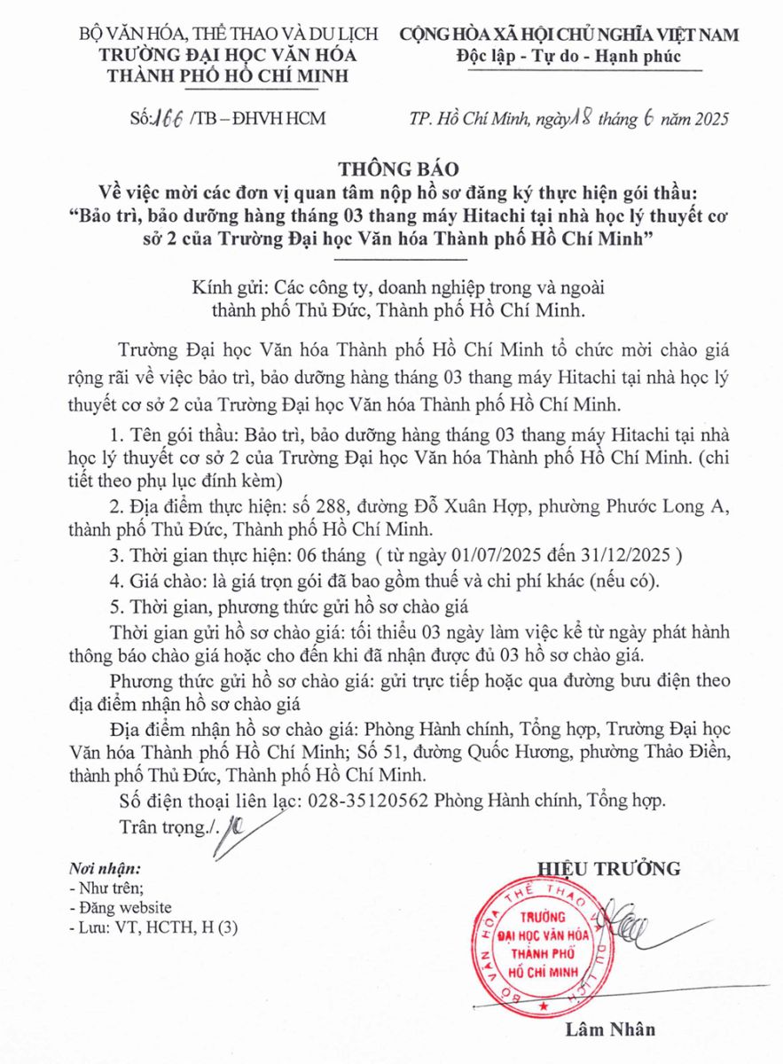 26.03.2026 Thông báo về việc mời các đơn vị quan tâm nộp hồ sơ đăng ký thực hiện gói thầu thực hiện dịch vụ bảo trì phần mềm quản trị Trường Đại học Văn hóa Thành phố Hồ Chí Minh