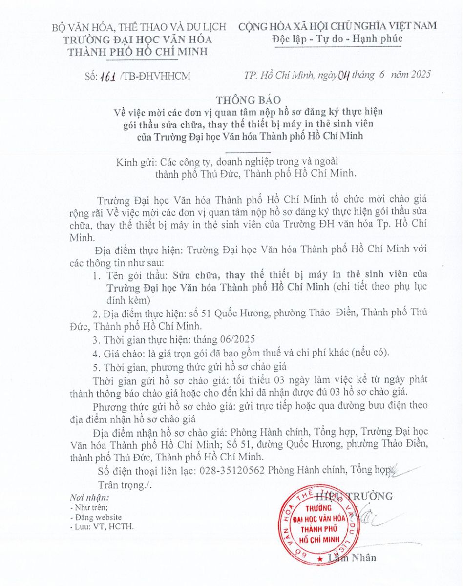 13.04.2026 Thông báo về việc mời các đơn vị quan tâm nộp hồ sơ đăng ký thực hiện gói thầu in ấn phôi bằng, chứng chỉ phục vụ cho công tác đào tạo và cấp phát văn bằng của Trường Đại học Văn hóa Thành phố Hồ Chí Minh
