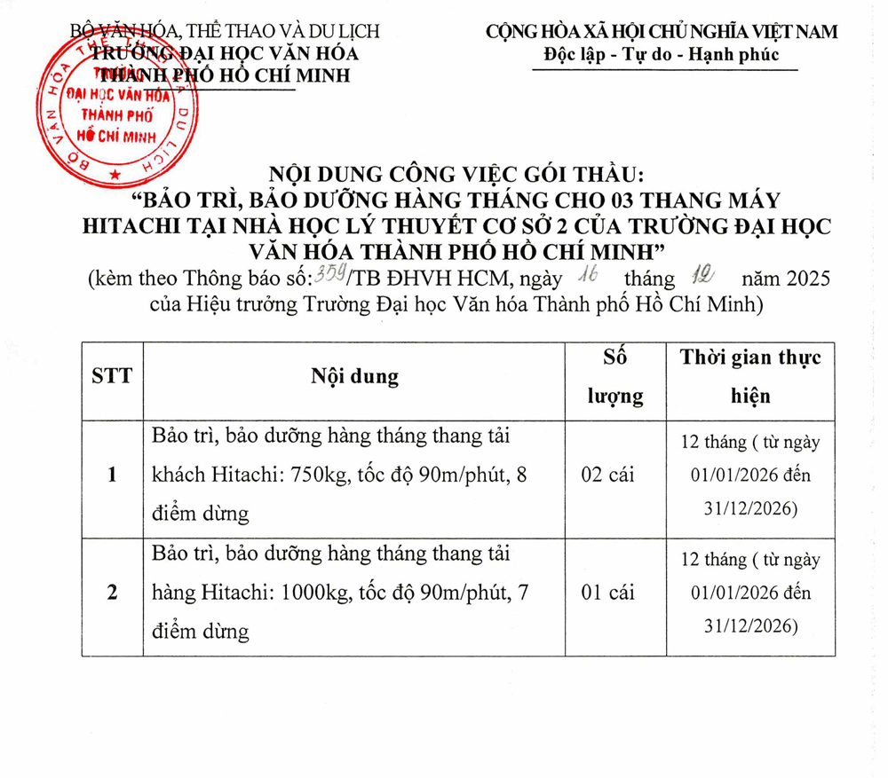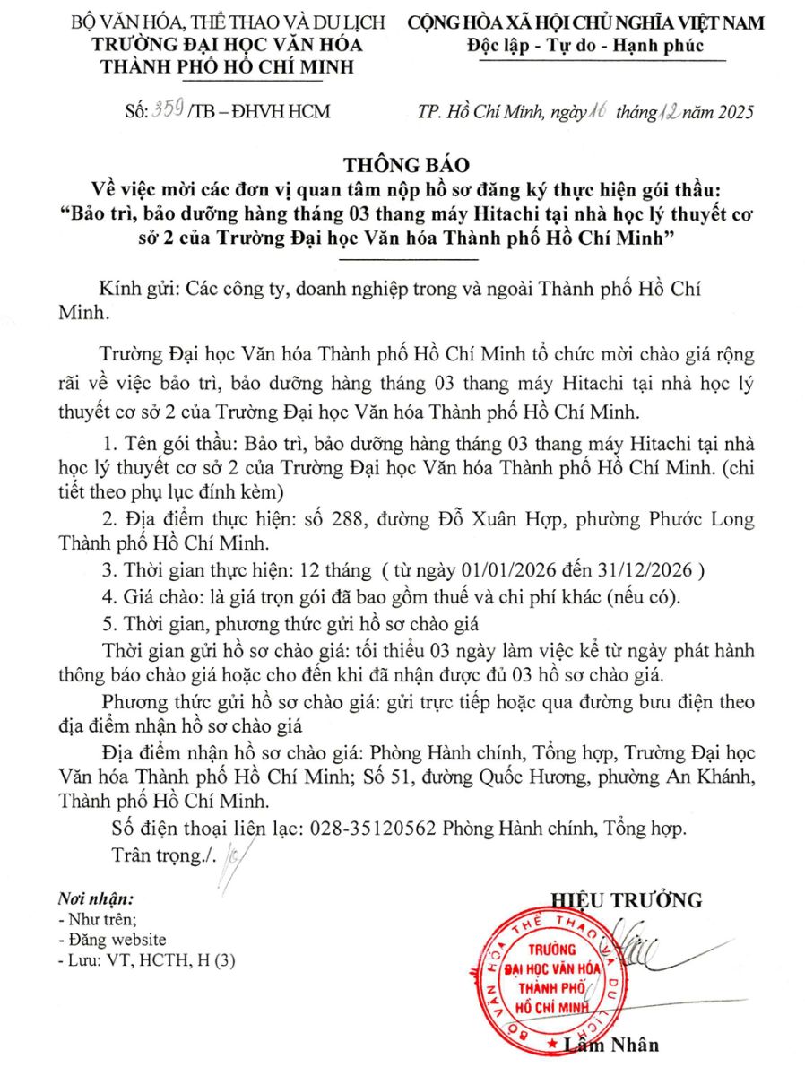 26.03.2026 Thông báo về việc mời các đơn vị quan tâm nộp hồ sơ đăng ký thực hiện gói thầu thực hiện dịch vụ bảo trì phần mềm quản trị Trường Đại học Văn hóa Thành phố Hồ Chí Minh