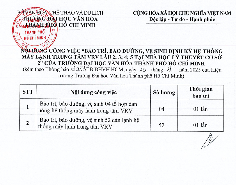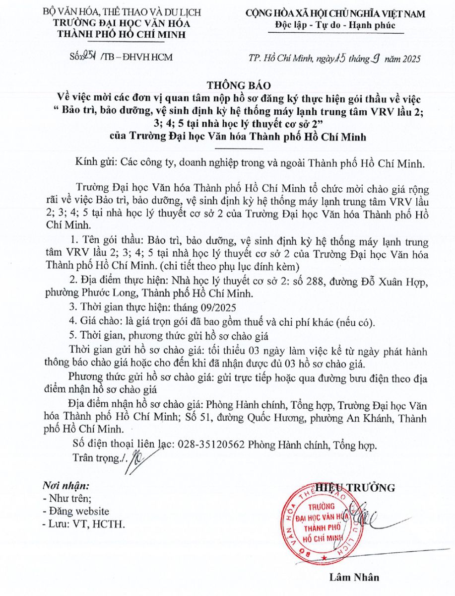 26.03.2026 Thông báo về việc mời các đơn vị quan tâm nộp hồ sơ đăng ký thực hiện gói thầu thực hiện dịch vụ bảo trì phần mềm quản trị Trường Đại học Văn hóa Thành phố Hồ Chí Minh