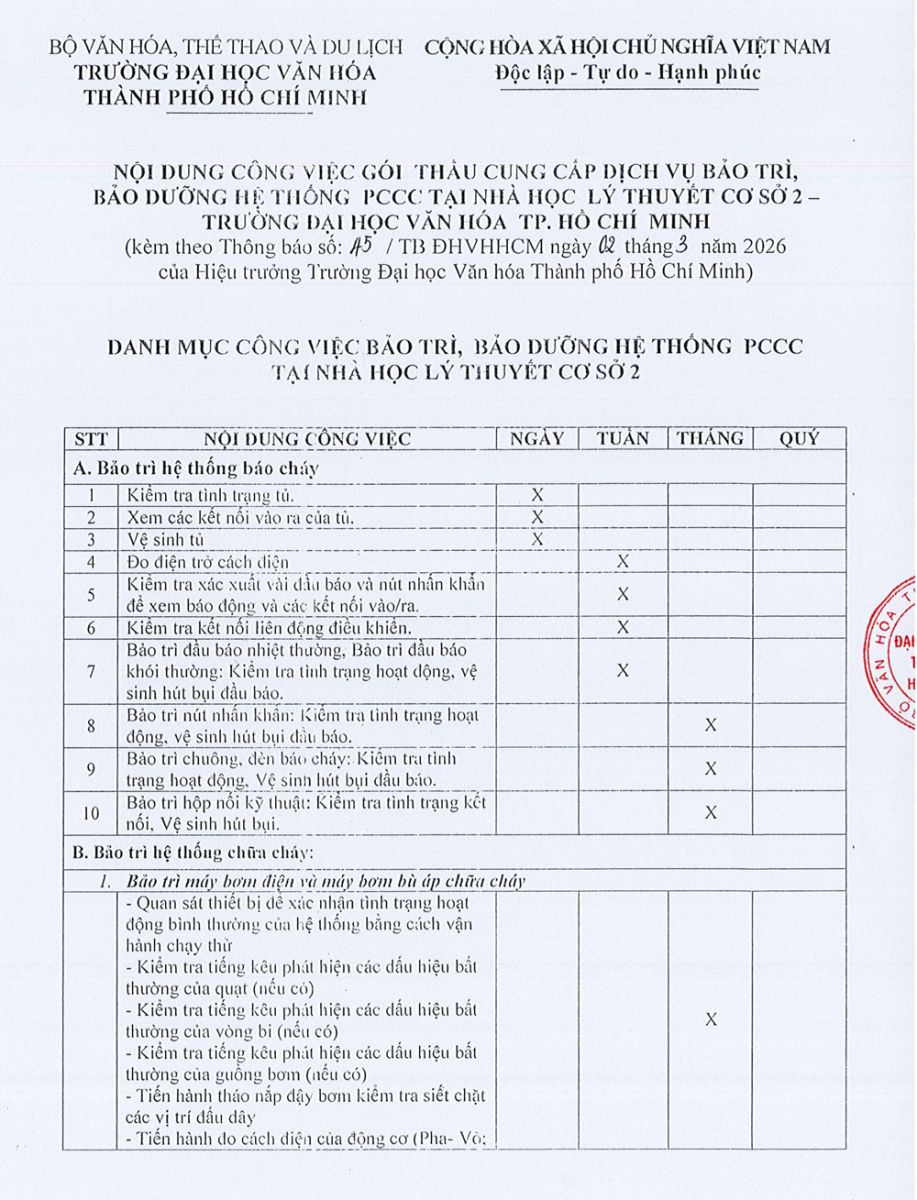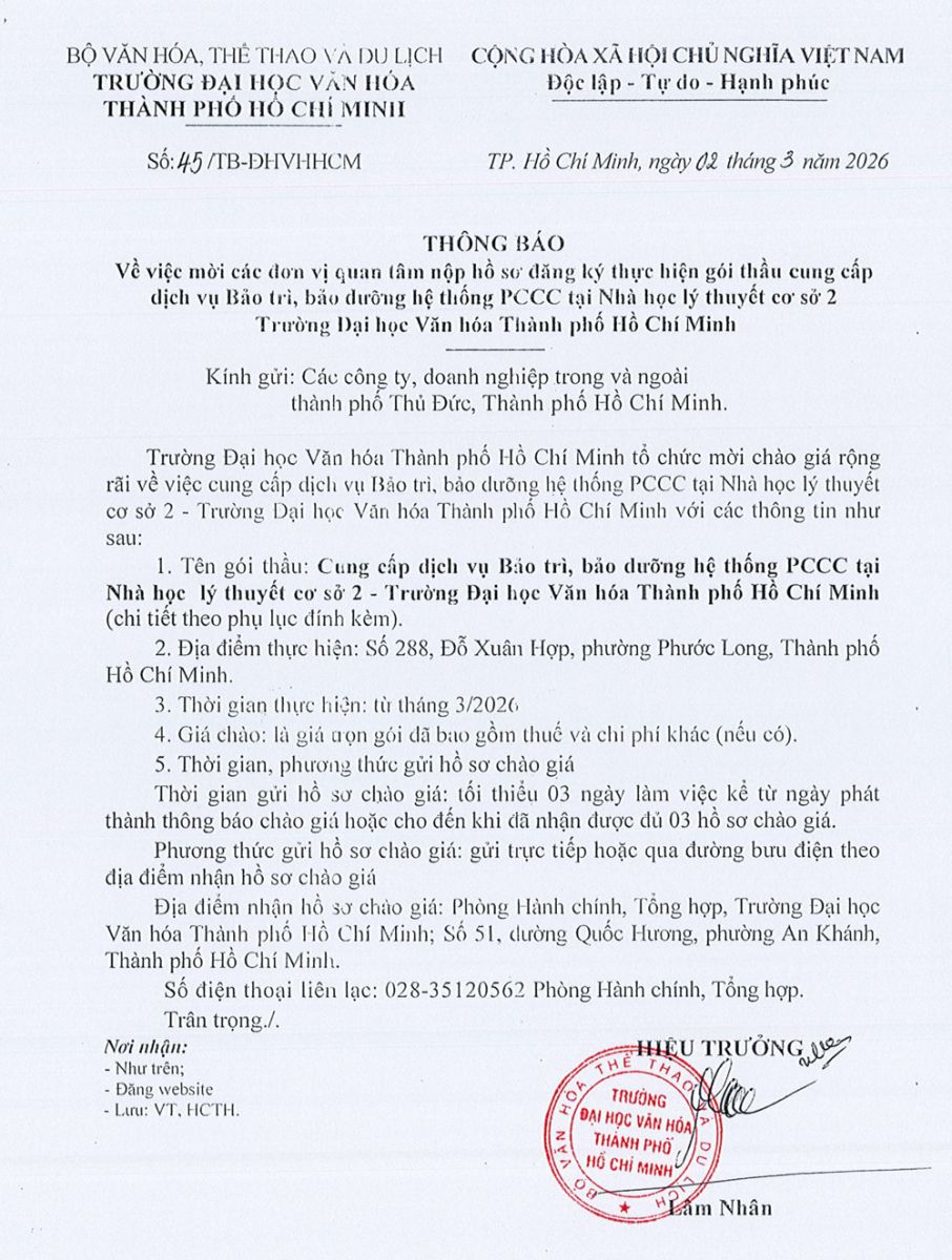 26.03.2026 Thông báo về việc mời các đơn vị quan tâm nộp hồ sơ đăng ký thực hiện gói thầu thực hiện dịch vụ bảo trì phần mềm quản trị Trường Đại học Văn hóa Thành phố Hồ Chí Minh