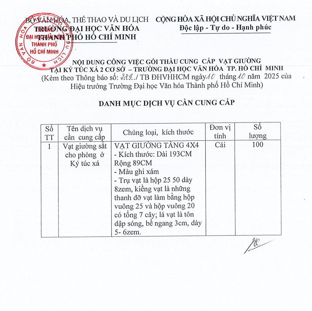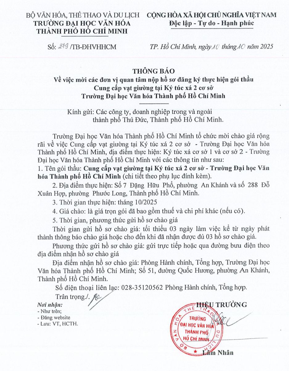 25.03.2026 Thông báo về việc mời các đơn vị quan tâm nộp hồ sơ đăng ký thực hiện gói thầu trang bị tủ gỗ đựng hồ sơ, bàn làm việc,... cho Trường Đại học Văn hóa Thành phố Hồ Chí Minh