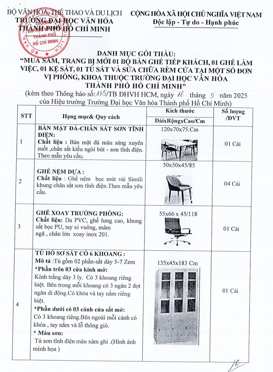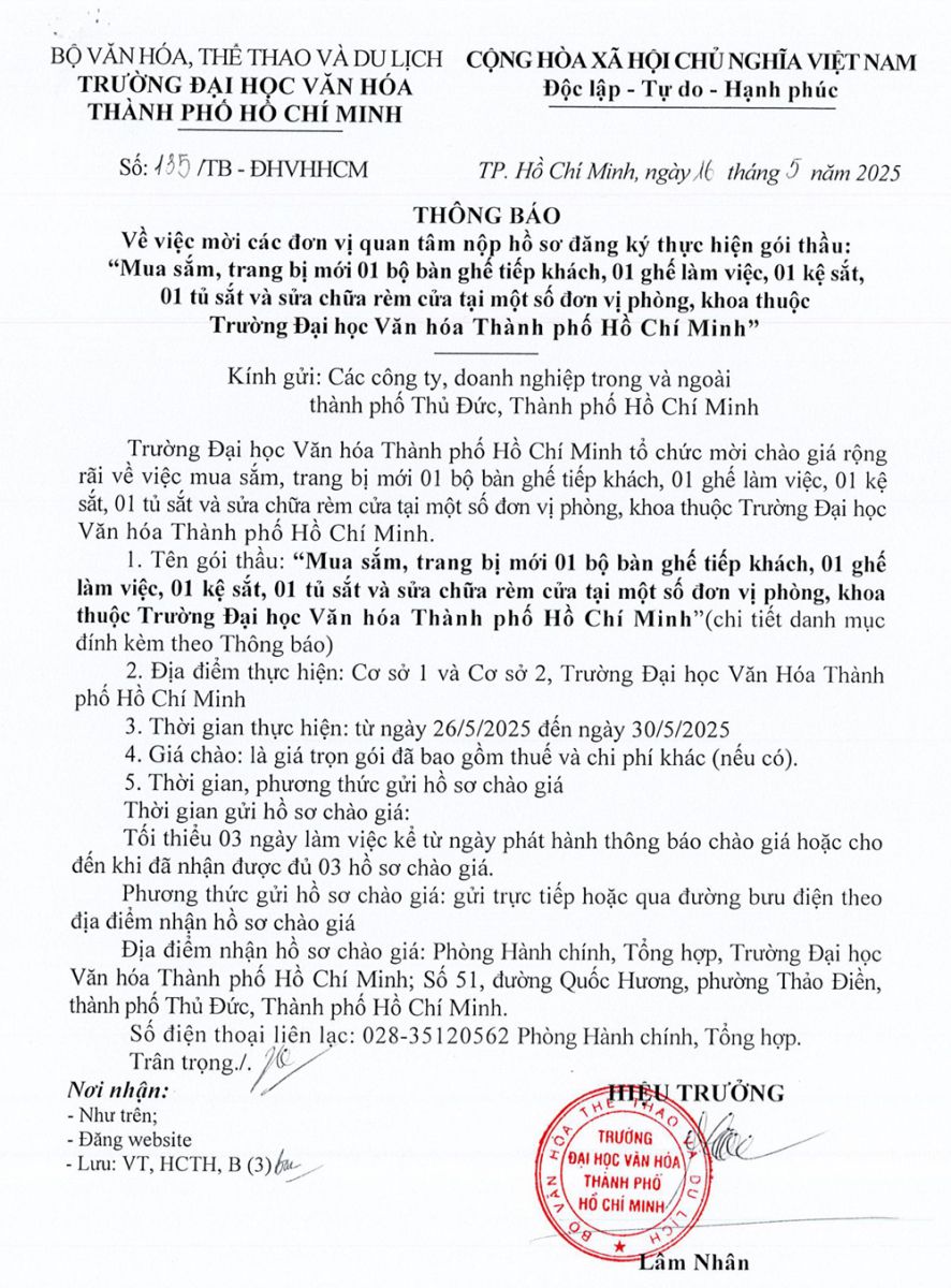 25.03.2026 Thông báo về việc mời các đơn vị quan tâm nộp hồ sơ đăng ký thực hiện gói thầu trang bị tủ gỗ đựng hồ sơ, bàn làm việc,... cho Trường Đại học Văn hóa Thành phố Hồ Chí Minh