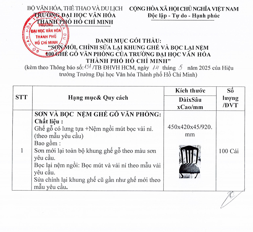 25.03.2026 Thông báo về việc mời các đơn vị quan tâm nộp hồ sơ đăng ký thực hiện gói thầu trang bị tủ gỗ đựng hồ sơ, bàn làm việc,... cho Trường Đại học Văn hóa Thành phố Hồ Chí Minh