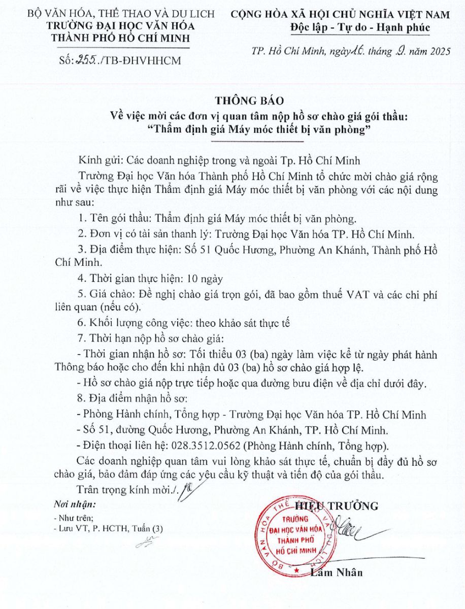 25.03.2026 Thông báo về việc mời các đơn vị quan tâm nộp hồ sơ đăng ký thực hiện gói thầu trang bị tủ gỗ đựng hồ sơ, bàn làm việc,... cho Trường Đại học Văn hóa Thành phố Hồ Chí Minh