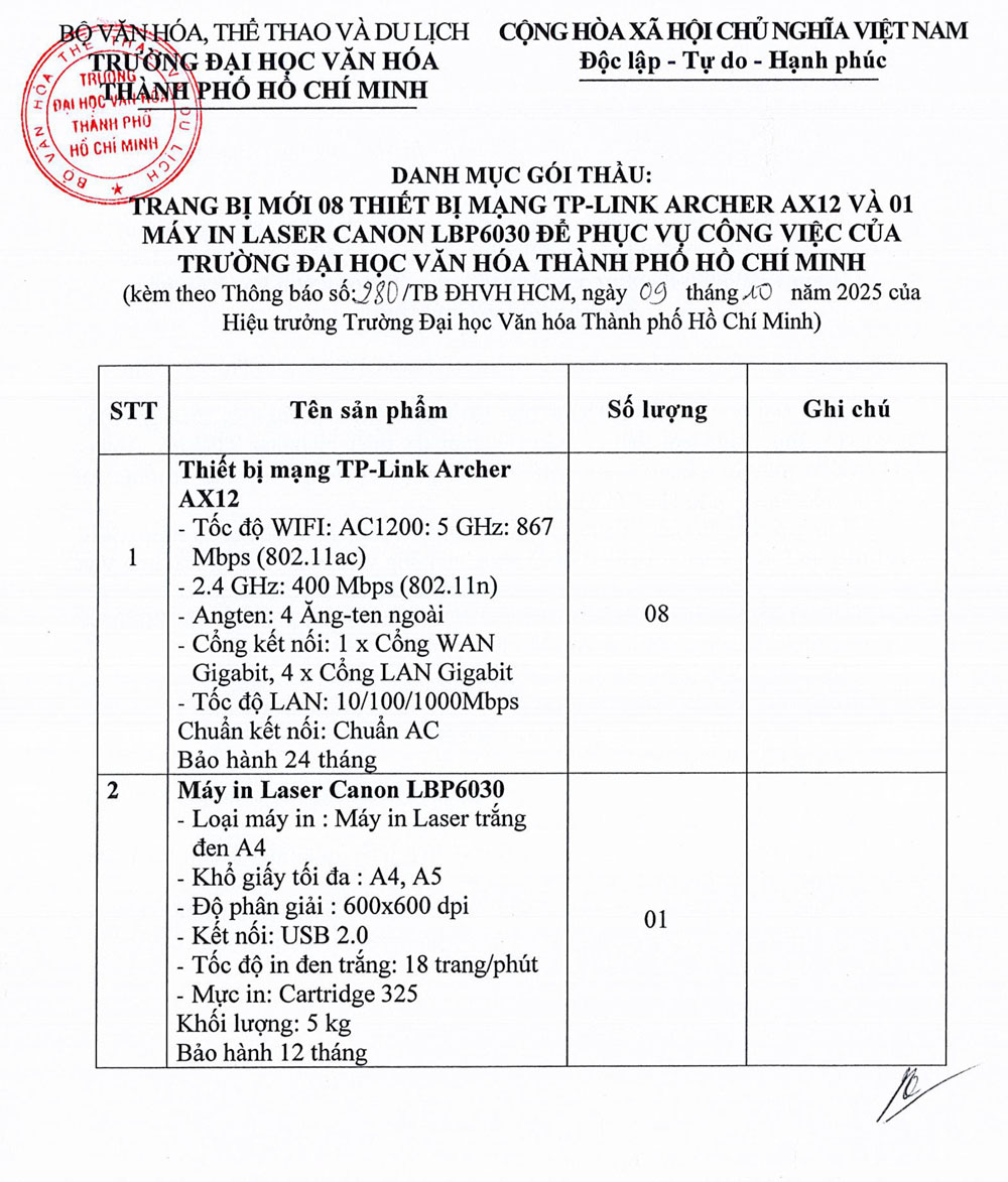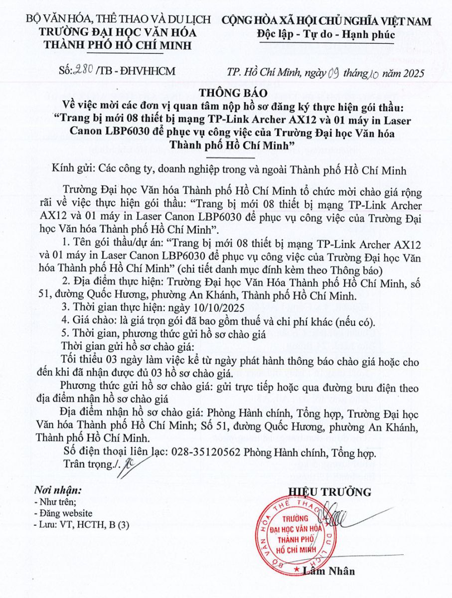 25.03.2026 Thông báo về việc mời các đơn vị quan tâm nộp hồ sơ đăng ký thực hiện gói thầu trang bị tủ gỗ đựng hồ sơ, bàn làm việc,... cho Trường Đại học Văn hóa Thành phố Hồ Chí Minh