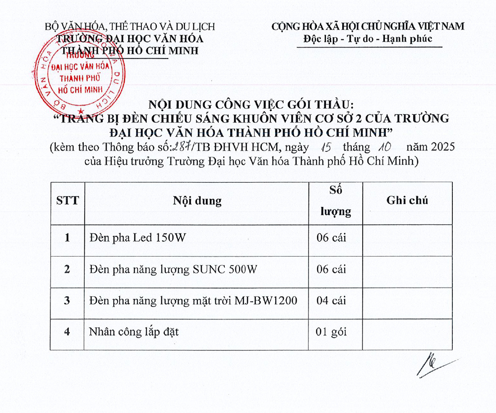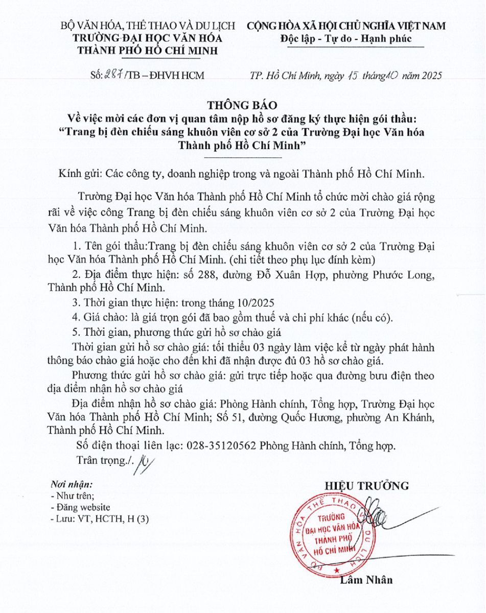 25.03.2026 Thông báo về việc mời các đơn vị quan tâm nộp hồ sơ đăng ký thực hiện gói thầu trang bị tủ gỗ đựng hồ sơ, bàn làm việc,... cho Trường Đại học Văn hóa Thành phố Hồ Chí Minh
