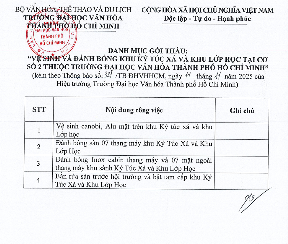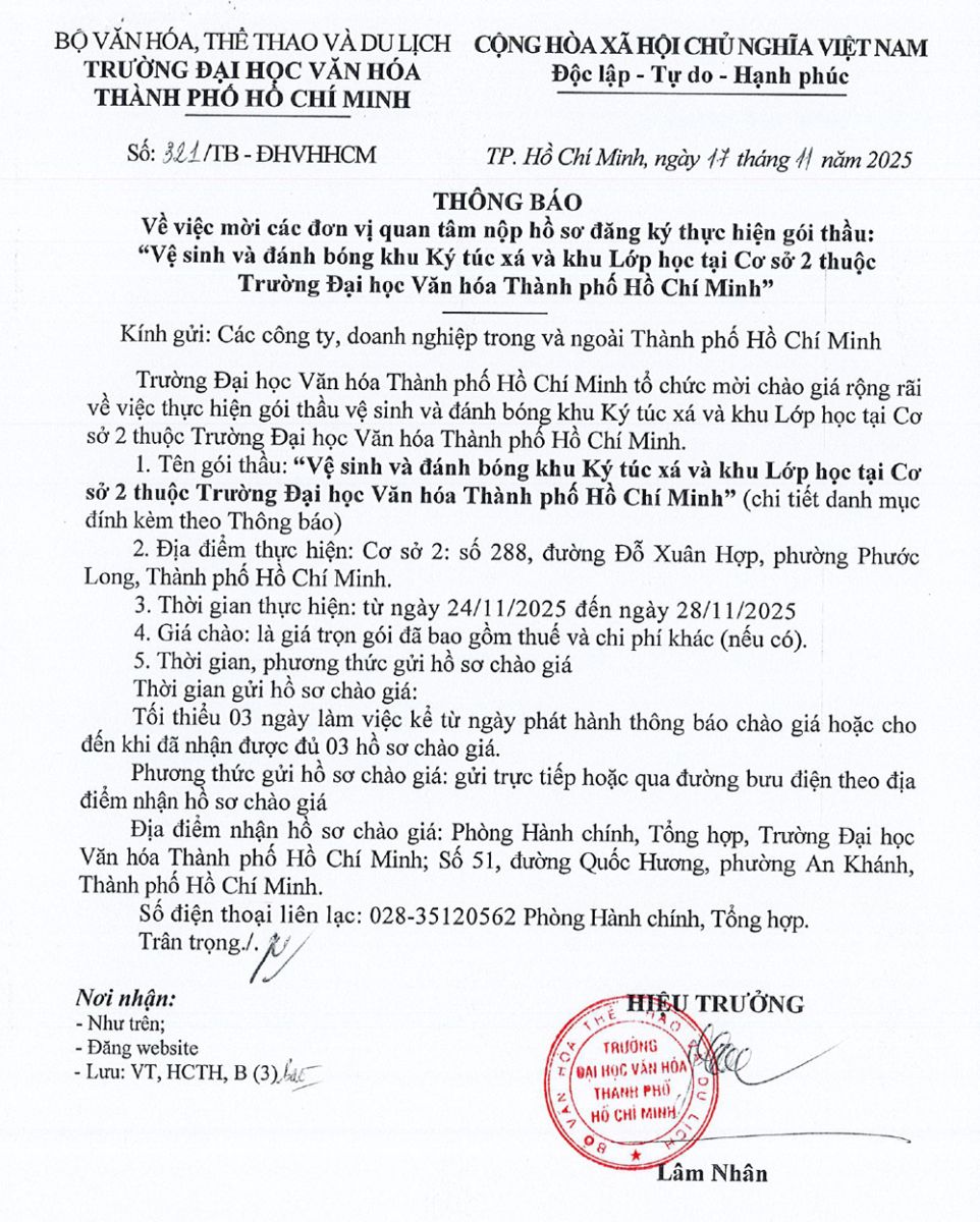 25.03.2026 Thông báo về việc mời các đơn vị quan tâm nộp hồ sơ đăng ký thực hiện gói thầu trang bị tủ gỗ đựng hồ sơ, bàn làm việc,... cho Trường Đại học Văn hóa Thành phố Hồ Chí Minh