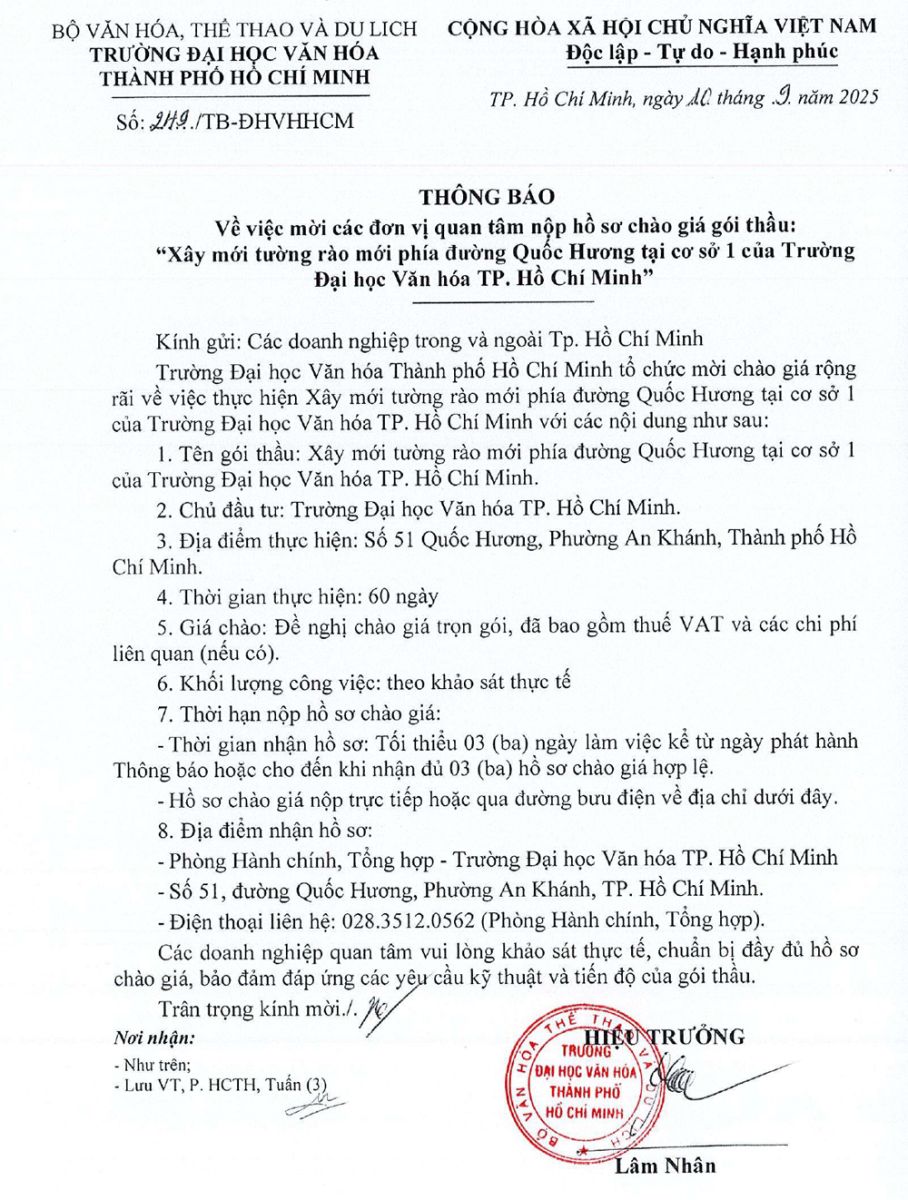 25.03.2026 Thông báo về việc mời các đơn vị quan tâm nộp hồ sơ đăng ký thực hiện gói thầu trang bị tủ gỗ đựng hồ sơ, bàn làm việc,... cho Trường Đại học Văn hóa Thành phố Hồ Chí Minh