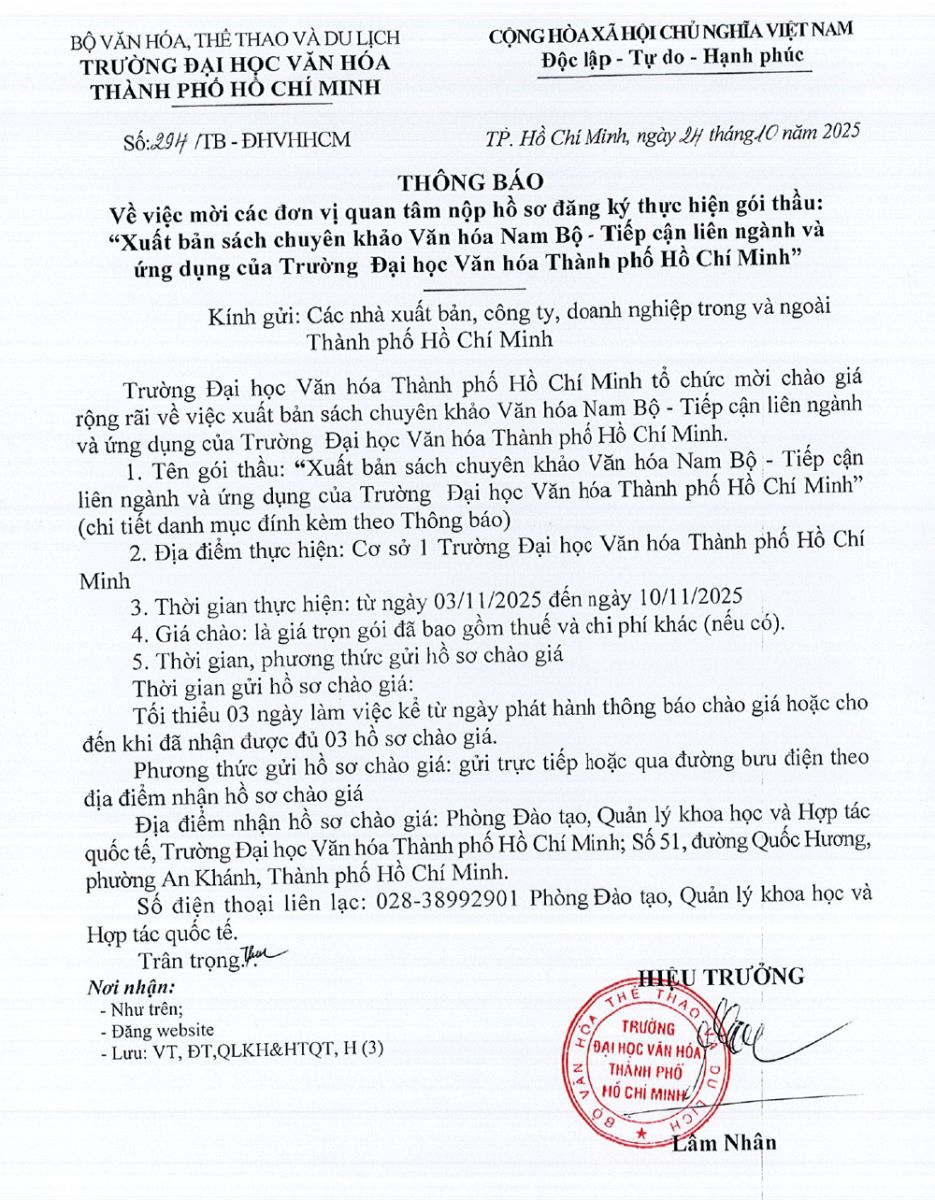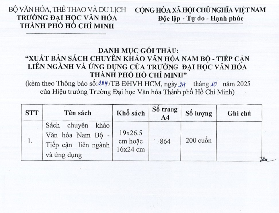 25.03.2026 Thông báo về việc mời các đơn vị quan tâm nộp hồ sơ đăng ký thực hiện gói thầu trang bị tủ gỗ đựng hồ sơ, bàn làm việc,... cho Trường Đại học Văn hóa Thành phố Hồ Chí Minh