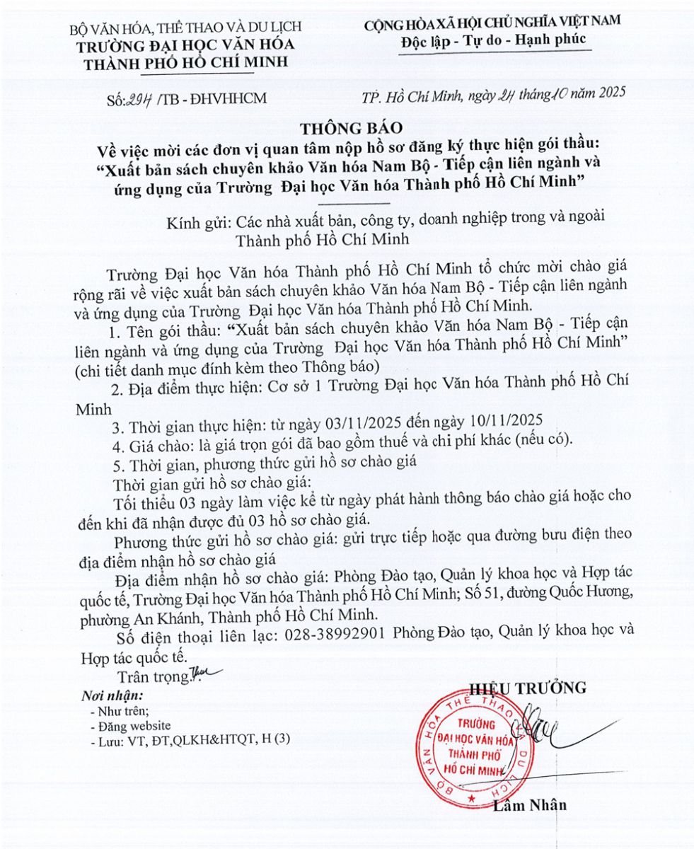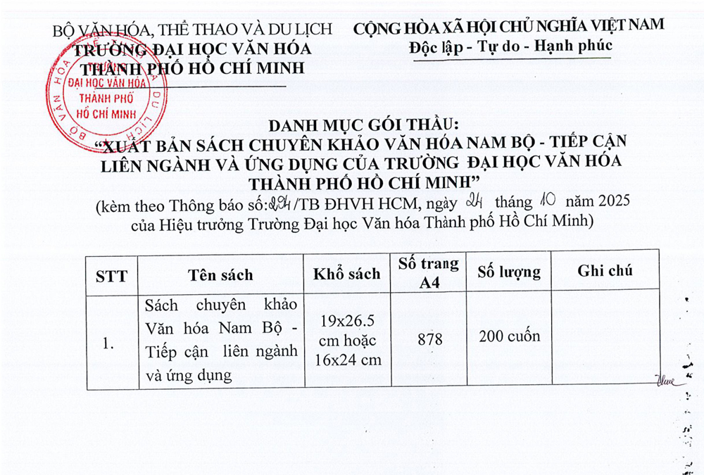 25.03.2026 Thông báo về việc mời các đơn vị quan tâm nộp hồ sơ đăng ký thực hiện gói thầu trang bị tủ gỗ đựng hồ sơ, bàn làm việc,... cho Trường Đại học Văn hóa Thành phố Hồ Chí Minh