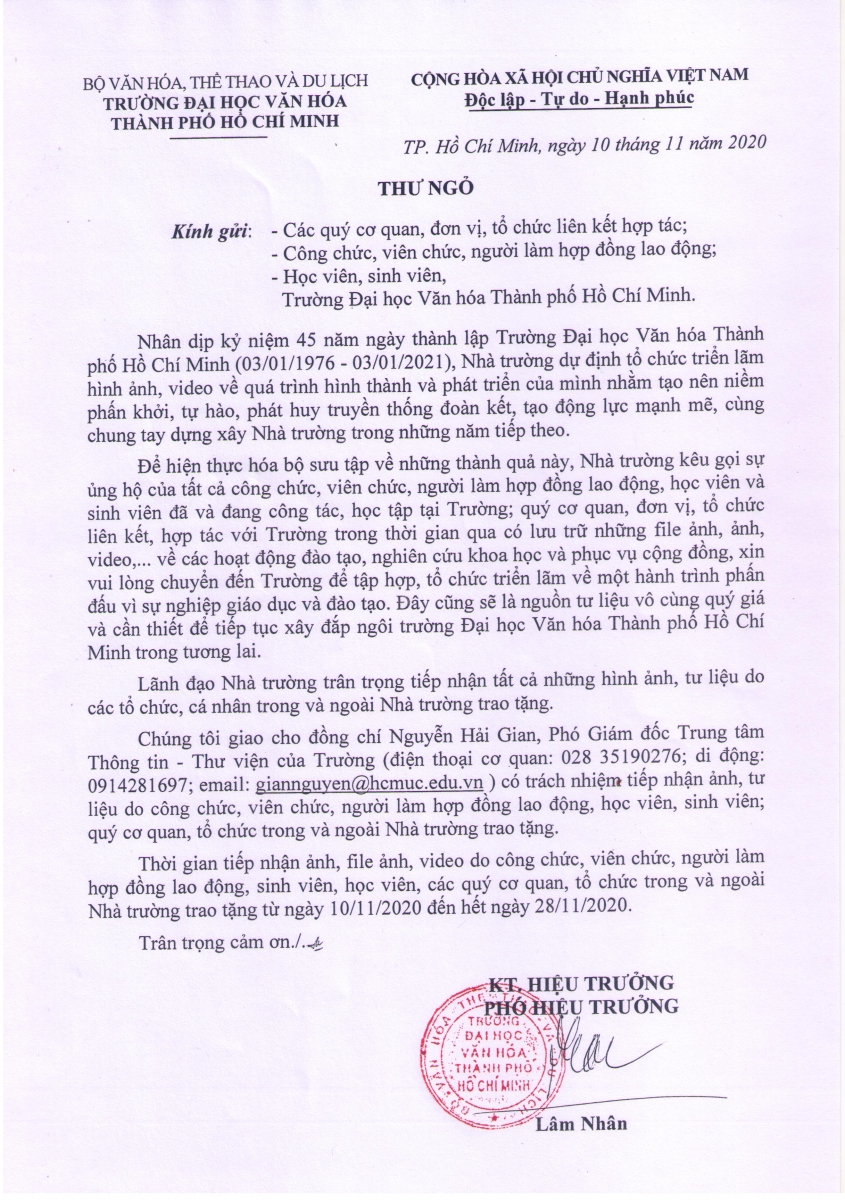 09 Nov Thư ngỏ về việc tiếp nhận đóng góp ảnh, tư liệu nhân dịp kỷ niệm 45 năm thành lập Trường Đại học Văn hóa TP. Hồ Chí Minh Nguyễn Hải Gian 3805 Xem Share: