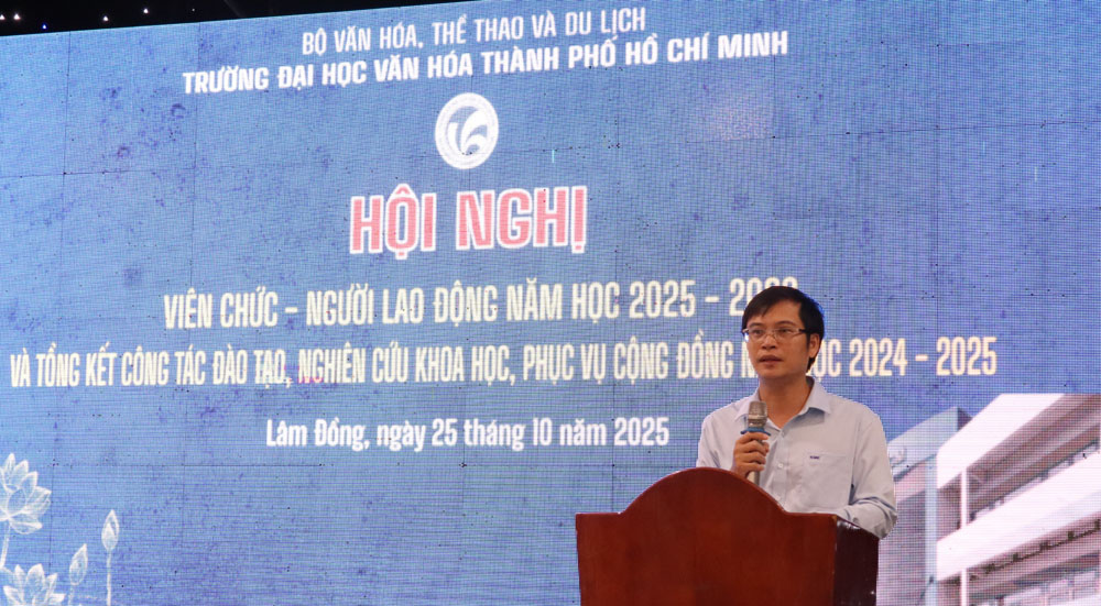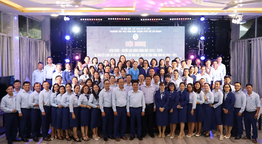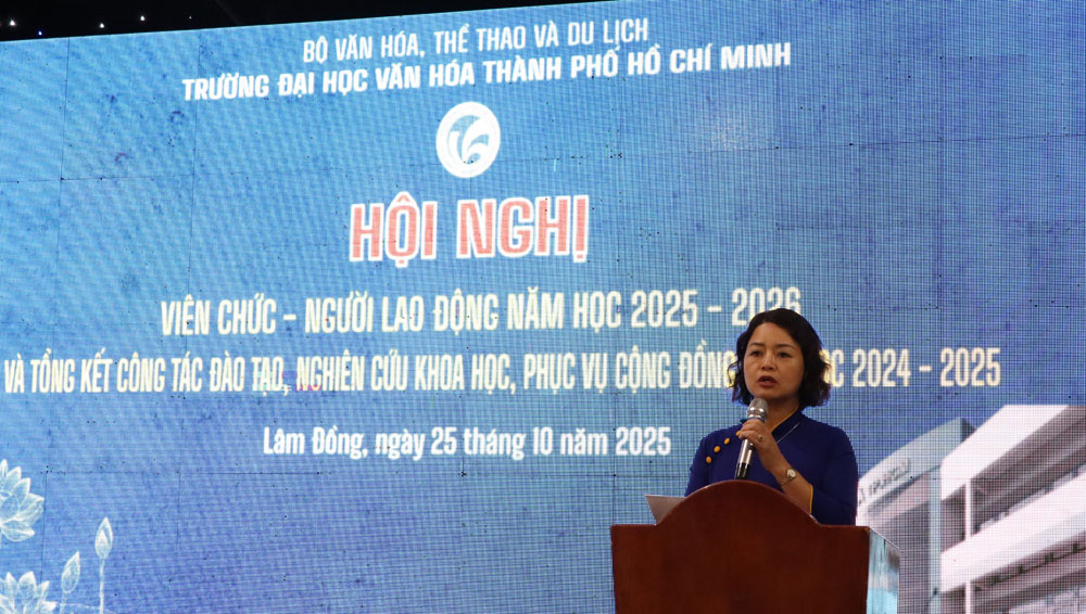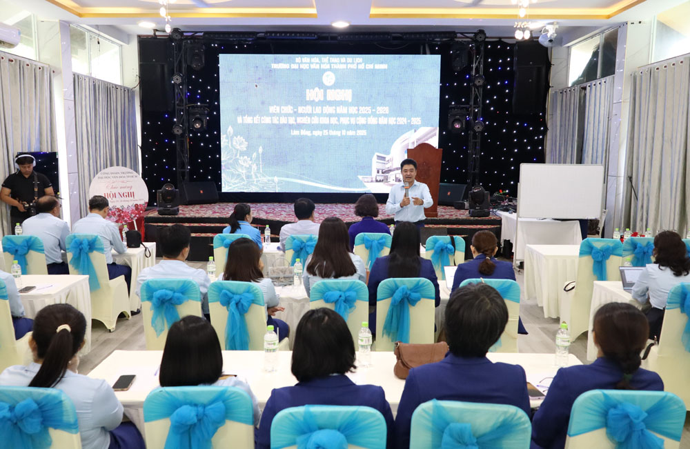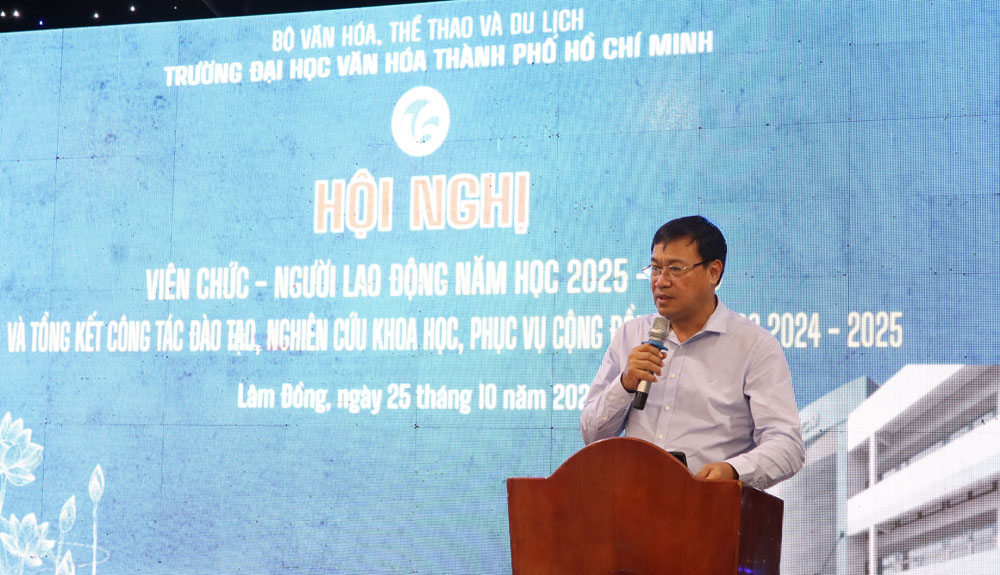 VHSO - Chiều ngày 25/10, tại phường Mũi Né (tỉnh Lâm Đồng), Trường Đại học Văn hóa Thành phố Hồ Chí Minh (HCMUC) tổ chức Hội nghị Viên chức, Người lao động năm học 2025-2026; kết hợp Tổng kết công tác đào tạo, nghiên cứu khoa học và phục vụ cộng đồng năm học 2024-2025. Đây là dịp quan trọng để toàn thể viên chức, người lao động cùng nhìn lại chặng đường một năm học đã qua, đồng thời đề ra phương hướng, nhiệm vụ cho năm học mới. Tham dự hội nghị về phía đại biểu khách mời có PGS.TS Đặng Hà Việt, Vụ trưởng Vụ Khoa học, Công nghệ, Đào tạo và Môi trường - Bộ Văn hóa, Thể thao và Du lịch; Bà Nguyễn Thị Mỹ Linh, Thành viên Tổ công tác số 1 Liên đoàn Lao động TP. Hồ Chí Minh. Về phía HCMUC có TS. Trịnh Đăng Khoa, Bí thư Đảng ủy, Chủ tịch Hội đồng trường; PGS.TS Lâm Nhân, Phó Bí thư Đảng ủy, Hiệu trưởng; TS. Lê Thị Thanh Thủy, Phó Hiệu trưởng; cùng Trưởng, Phó các đơn vị trực thuộc và toàn thể viên chức, người lao động nhà trường.