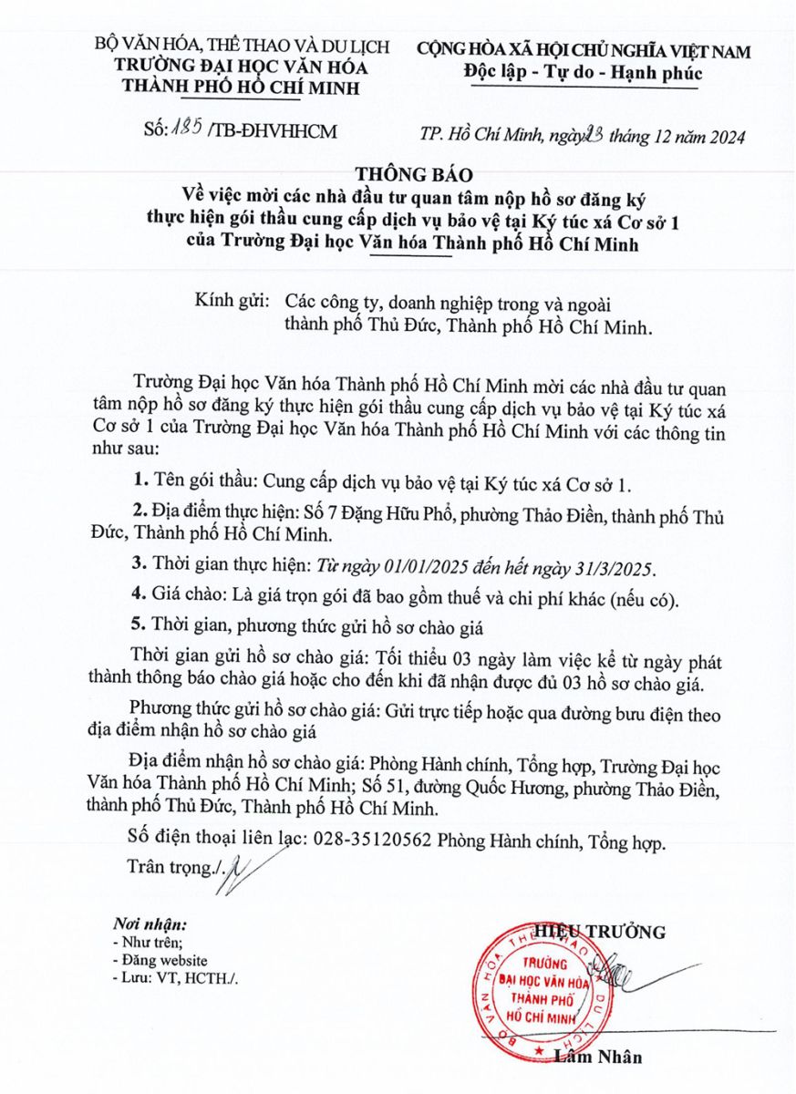 26.03.2026 Thông báo về việc mời các đơn vị quan tâm nộp hồ sơ đăng ký thực hiện gói thầu thực hiện dịch vụ bảo trì phần mềm quản trị Trường Đại học Văn hóa Thành phố Hồ Chí Minh