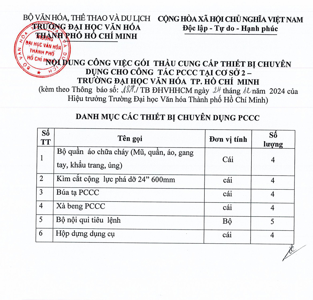 25.03.2026 Thông báo về việc mời các đơn vị quan tâm nộp hồ sơ đăng ký thực hiện gói thầu trang bị tủ gỗ đựng hồ sơ, bàn làm việc,... cho Trường Đại học Văn hóa Thành phố Hồ Chí Minh