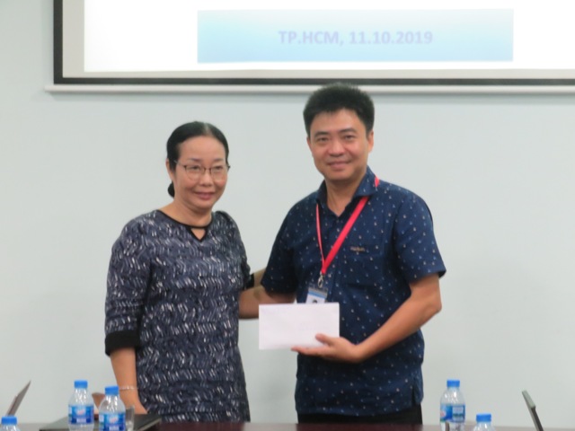 Thay mặt BGH nhà trường, PGS.TS. Lâm Nhân nhận số tiền 30.000.000đ từ Bà Huỳnh Thị Ngọc Vân – Nguyên Giám đốc Bảo tàng Chứng tích Chiến tranh để làm học bổng cho sinh viên.
