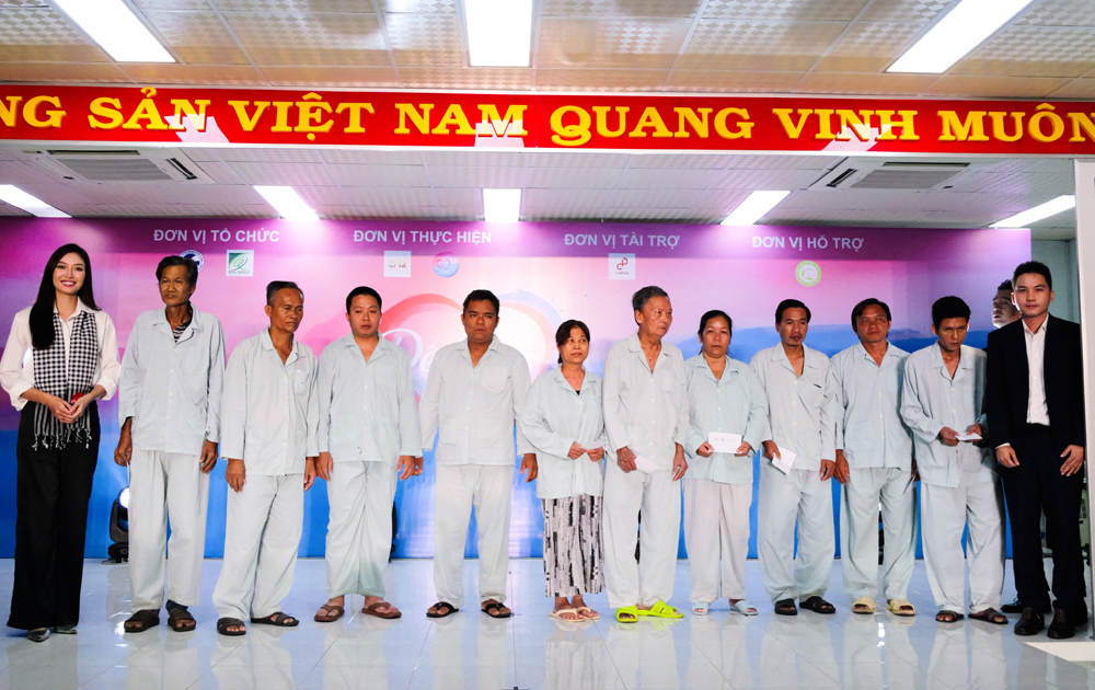 Ông Cao Thanh Phong- Nhà tài trợ độc quyền cuả chương trình, Đương kim hoa hậu Sông Vàm - Huỳnh Đào Diễm Trinh trao quà cho các bệnh nhân.