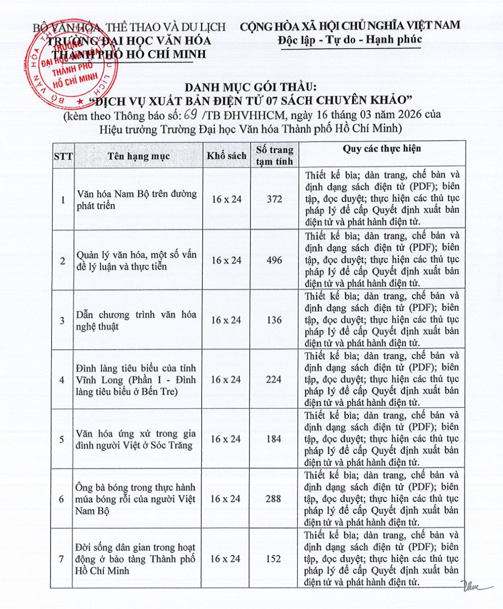 16.03.2026 Thông báo về việc mời các đơn vị quan tâm nộp hồ sơ đăng ký thực hiện gói thầu xuất bản điện tử 07 sách chuyên khảo cho Trường Đại học Văn hóa Thành phố Hồ Chí Minh
