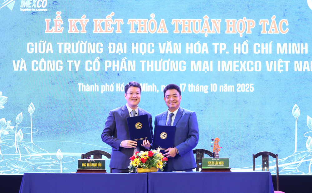 Dịp này, HCMUC và Công ty Cổ phần Thương mại IMEXCO Việt Nam đã ký kết thỏa thuận hợp tác toàn diện trong lĩnh vực nghiên cứu, đào tạo và quảng bá giá trị văn hóa Việt Nam. Thỏa thuận này không chỉ đánh dấu bước phát triển mới trong mối quan hệ giữa nhà trường và doanh nghiệp, mà còn mở ra nhiều cơ hội để sinh viên được học hỏi, trải nghiệm thực tế cùng các chuyên gia, nghệ nhân và đơn vị hoạt động trong lĩnh vực văn hóa. Thông qua sự hợp tác này, HCMUC tiếp tục khẳng định vai trò là trung tâm đào tạo, sáng tạo và lan tỏa văn hóa, nơi những giá trị truyền thống được gìn giữ, phát huy và hòa quyện cùng hơi thở hiện đại, góp phần đưa văn hóa Việt Nam đến gần hơn với cộng đồng trong nước và bạn bè quốc tế.