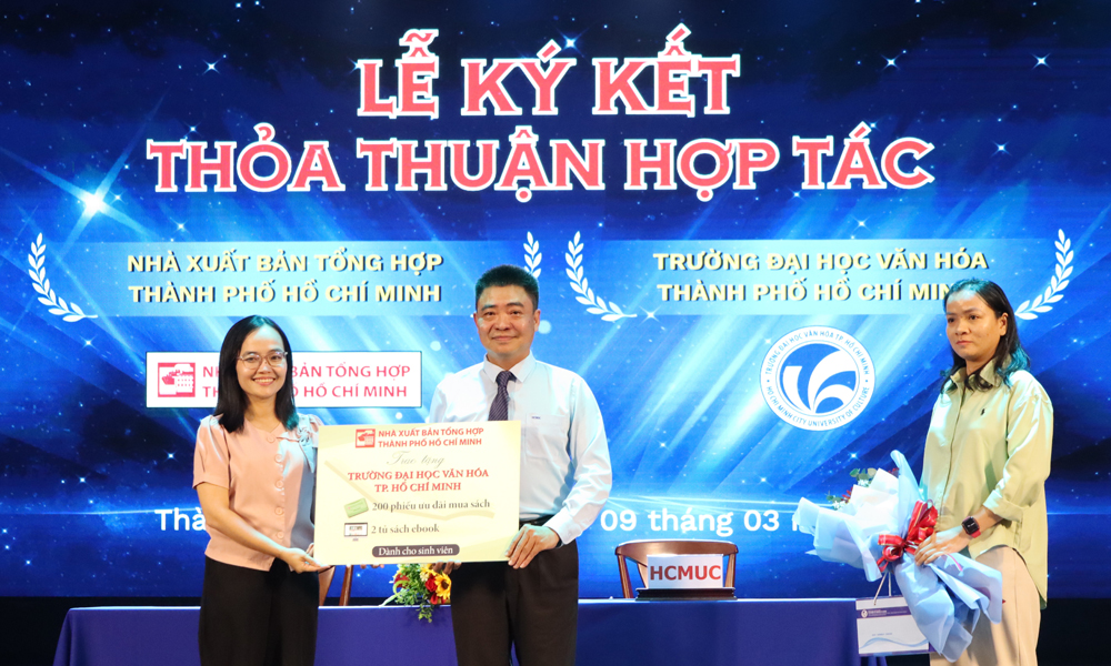Bà Ông Thị Ngọc Linh, Phó Giám đốc, Phó Tổng biên tập Nhà xuất bản Tổng hợp Thành phố Hồ Chí Minh trao bảng biểu trưng tặng tủ sách điện tử cho Thư viện HCMUC.