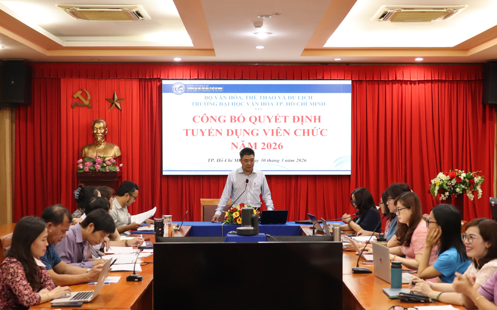 VHSO - Chiều ngày 30/3, Trường Đại học Văn hóa TP. Hồ Chí Minh (HCMUC) đã trang trọng tổ chức lễ công bố và trao quyết định của Hiệu trưởng về việc tuyển dụng viên chức đối với các thí sinh trúng tuyển kỳ tuyển dụng viên chức trong các đơn vị sự nghiệp công lập thuộc Bộ Văn hóa, Thể thao và Du lịch năm 2026. Đây là kỳ tuyển dụng do Bộ Văn hóa, Thể thao và Du lịch tổ chức với quy trình chặt chẽ, nhằm tuyển chọn những ứng viên có trình độ chuyên môn, năng lực và phẩm chất phù hợp, góp phần nâng cao chất lượng nguồn nhân lực cho các đơn vị trực thuộc.