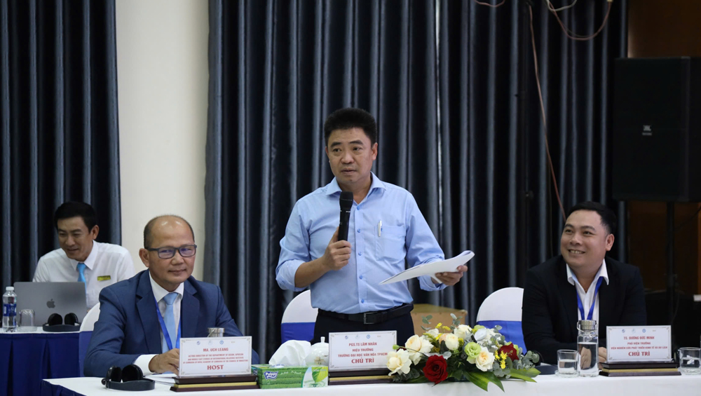 PGS.TS. Lâm Nhân, Hiệu trưởng Trường Đại học Văn hóa Thành phố Hồ Chí Minh phát biểu tại Hội thảo. Ảnh: Thái Tám.