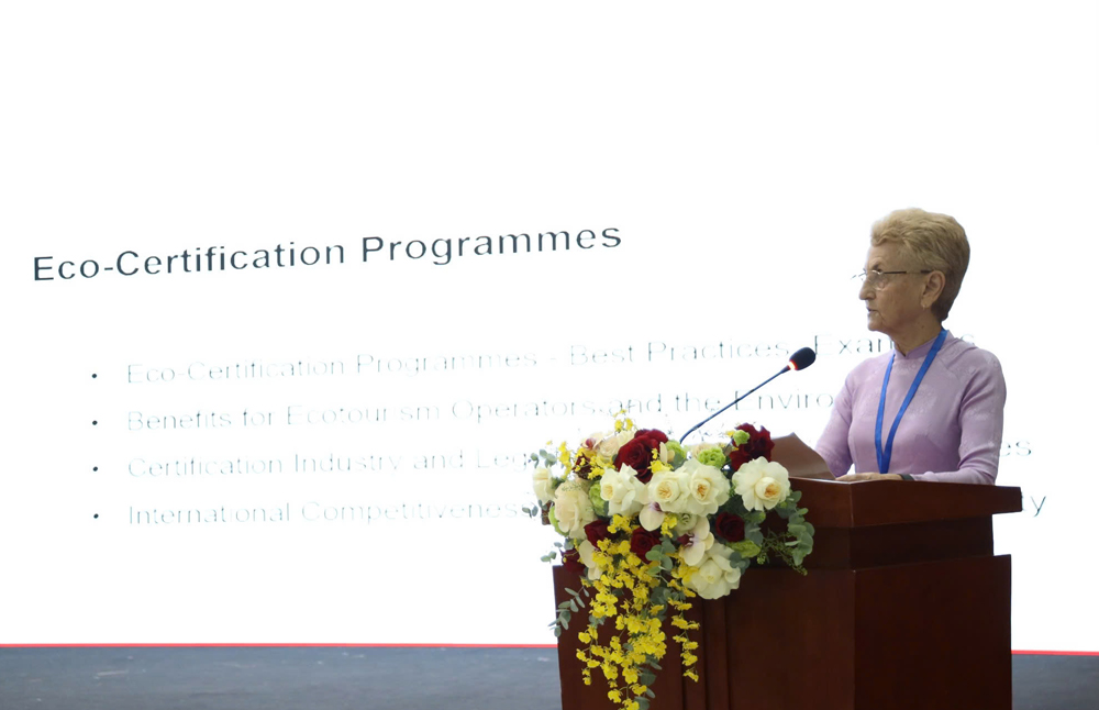 TS. Lawson Veronica Janet Lesley, Chương trình Tình nguyện viên Úc - Việt Nam trình bày tham luận “Phát triển du lịch bền vững gắn với tăng trưởng xanh và mục tiêu không phát thải”. Ảnh: Thái Tám.