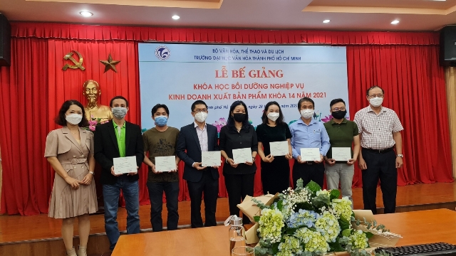 Sau gần 1 tuần học tập, sáng ngày 28/11/2021, Trường Đại học Văn hóa TP. Hồ Chí Minh đã tổ chức Lễ bế giảng và trao chứng chỉ cho 26 học viên khóa đào tạo ngắn hạn, Lớp bồi dưỡng nghiệp vụ kinh doanh xuất bản phẩm, khoá 14. Tham dự buổi lễ có; PGS.TS. Nguyễn Thế Dũng - Hiệu trưởng Trường Đại học Văn hóa TP. Hồ Chí Minh; quý thầy cô giáo khoa Xuất bản, Phát hành; Phòng Đào tạo, Nghiên cứu khoa học và Hợp tác Quốc tế; cùng toàn thể các anh chị học viên lớp bồi dưỡng nghiệp vụ kinh doanh xuất bản phẩm khóa 14.