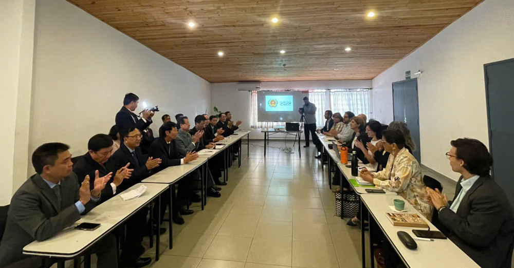 Đoàn đại biểu Việt Nam tham dự kỳ họp thứ 19 của Ủy ban Liên chính phủ Công ước 2003 về Bảo vệ Di sản văn hóa phi vật thể chụp ảnh lưu niệm cùng đại diện Đảng Cộng sản Paraguay.