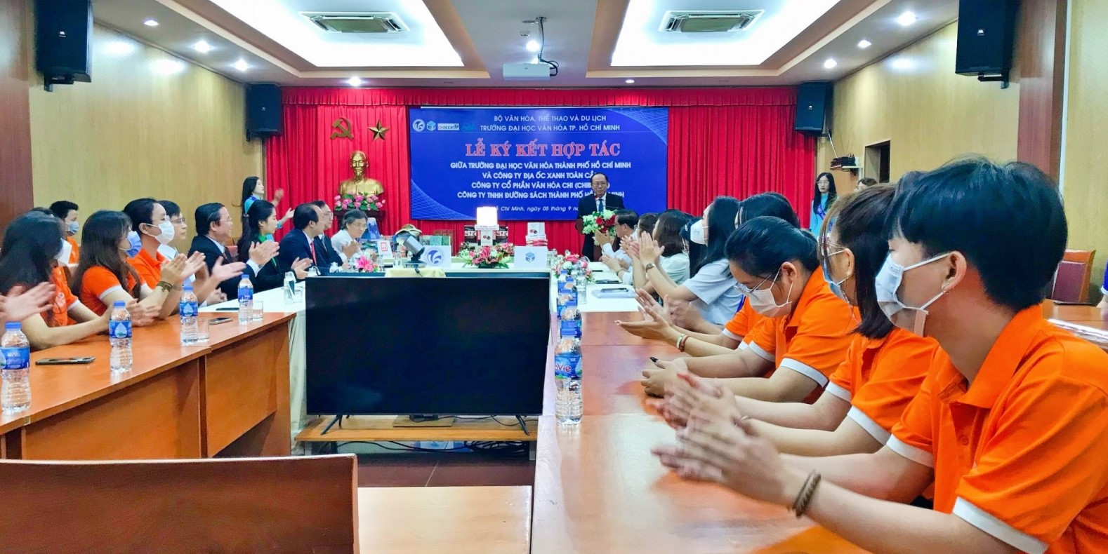 Sáng ngày 05/09/2022 tại Phòng Hội Thảo, Trường Đại học Văn hoá Tp. HCM đã diễn ra lễ ký kết hợp tác trong hoạt động đào tạo và nghiên cứu khoa học giữa Trường ĐH Văn hoá Tp. HCM với 2 doanh nghiệp là Công ty TNHH Đường sách Tp. HCM (Bookstreet HCMC) và Công ty Cổ phần Văn hoá Chi (Chibooks).