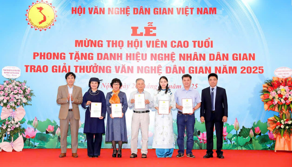 Đại diện Ban Chấp hành Hội Văn nghệ dân gian Việt Nam trao Giải thưởng Văn nghệ dân gian năm 2025 cho các cá nhân đạt giải.