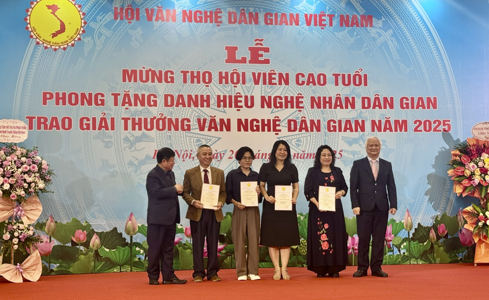 GS.TS Lê Hồng Lý (ngoài cùng bên phải), Chủ tịch Hội Văn nghệ dân gian Việt Nam trao Giải thưởng Văn nghệ dân gian năm 2025 cho các cá nhân xuất sắc.