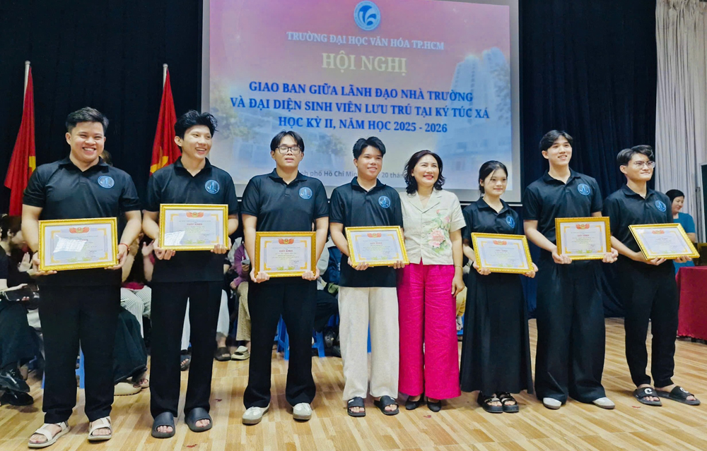 Trong khuôn khổ buổi giao ban, Phòng Công tác Sinh viên cũng đã công bố kết quả cuộc thi “Phòng ở sạch - đẹp - kiểu mẫu tại ký túc xá trong năm học 2025 - 2026”. Hoạt động này nhằm khuyến khích sinh viên nâng cao ý thức giữ gìn vệ sinh môi trường sống, xây dựng không gian sinh hoạt gọn gàng, ngăn nắp và văn minh. Kết quả, Ban Tổ chức đã trao: 01 giải Nhất; 02 giải Nhì; 02 giải Ba và 28 giải Khuyến khích. Bên cạnh đó, 07 sinh viên có nhiều đóng góp tích cực trong công tác tự quản phòng và xây dựng nếp sống ký túc xá cũng được tuyên dương, khen thưởng.