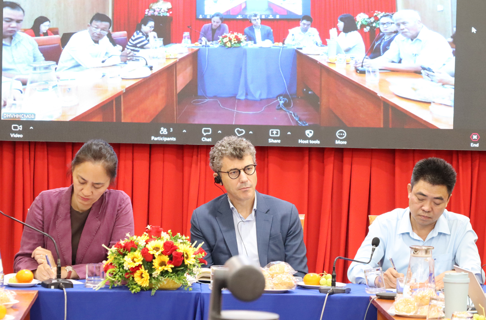 Ông Jonathan Baker (giữa), Trưởng đại diện Văn phòng UNESCO tại Hà Nội; PGS.TS Lâm Nhân, Hiệu trưởng HCMUC và bà Phạm Thị Thanh Hường, Trưởng Ban Văn hóa, Văn phòng UNESCO tại Hà Nội chủ trì buổi họp.
