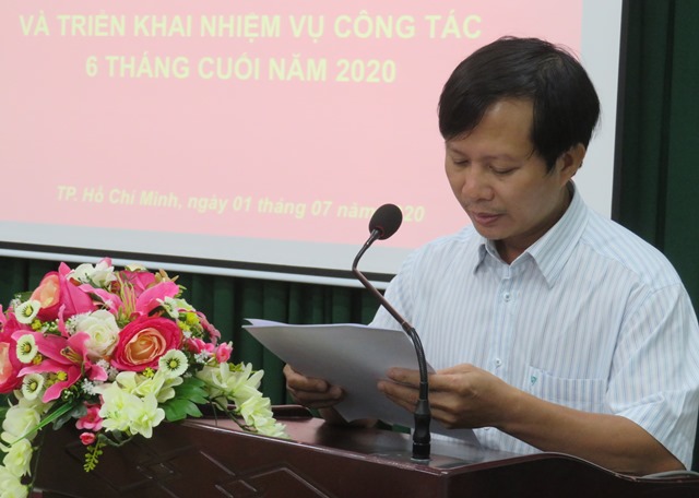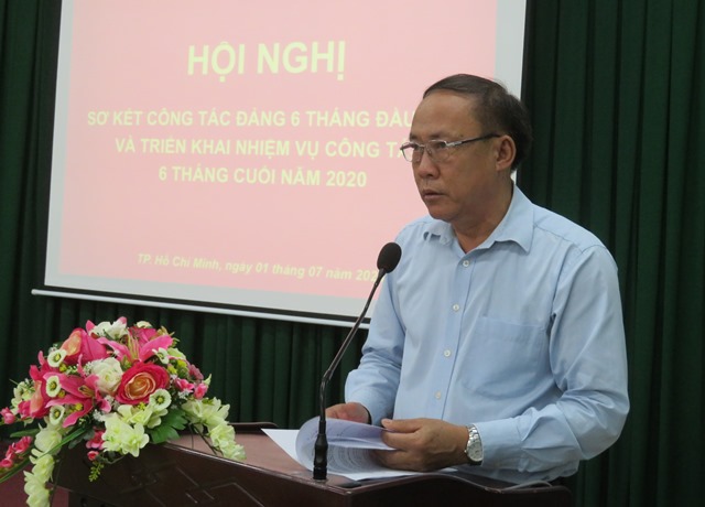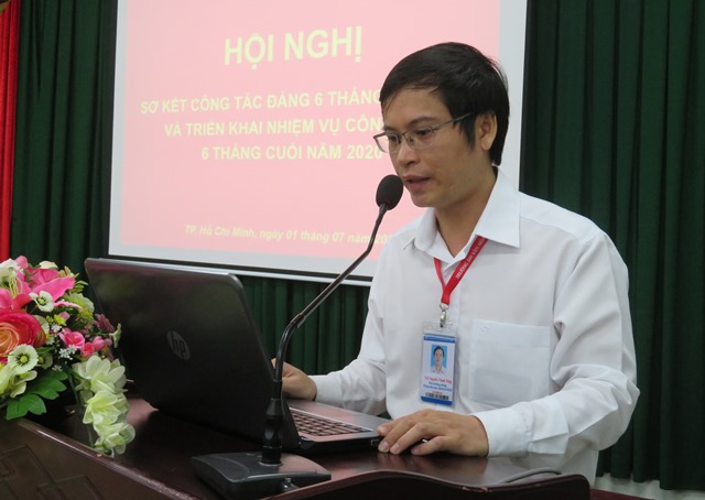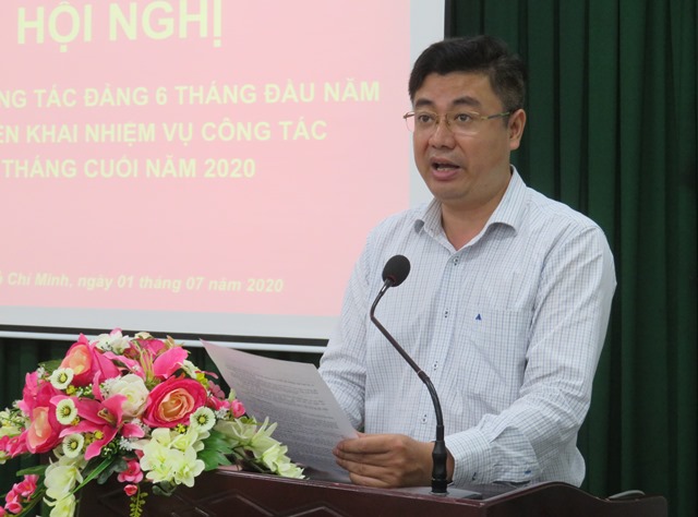 Thay mặt Ban chấp hành Đảng bộ, Đ/c Bùi Văn Việt - Ủy viên Ban thường vụ Đảng ủy, trình bày tóm tắt dự thảo báo cáo sơ kết công tác Đảng 6 tháng đầu năm 2020 và phương hướng, nhiệm vụ công tác 6 tháng cuối năm 2020. Báo cáo đã nêu rõ những kết quả nổi bật trong lãnh đạo, chỉ đạo của Đảng ủy Nhà trường trong việc thực hiện nhiệm vụ chính trị của đơn vị theo lĩnh vực được giao, triển khai xây dựng các chương trình hành động, công tác phối hợp giữa cấp ủy và lãnh đạo đơn vị trong lãnh đạo thực hiện nhiệm vụ chính trị 6 tháng đầu năm 2020; Các công tác xây dựng Đảng về chính trị, tư tưởng, đạo đức; Công tác tổ chức, cán bộ; Công tác kiểm tra, giám sát; Công tác dân vận và lãnh đạo các đoàn thể,…Sáu tháng đầu năm 2020, Đảng ủy đã lãnh đạo, chỉ đạo toàn trường vừa thực hiện công tác chuyên môn vừa thực hiện chống dịch bệnh COVID-19 theo quy định của Nhà nước. Trường Đại học Văn hóa TP. Hồ Chí Minh đã thực hiện cơ bản, có hiệu quả những nhiệm vụ, công việc chuyên môn và công tác xây dựng Đảng bộ so với phương hướng và nhiệm vụ năm 2020 mà Đảng bộ đã thống nhất đề ra tại hội nghị Đảng bộ ngày 16/01/2020. Bên cạnh những kết quả đã đạt được trong 6 tháng đầu năm 2020, vẫn còn một số tồn tại, hạn chế cần phải khắc phục trong thời gian 6 tháng cuối năm 2020.