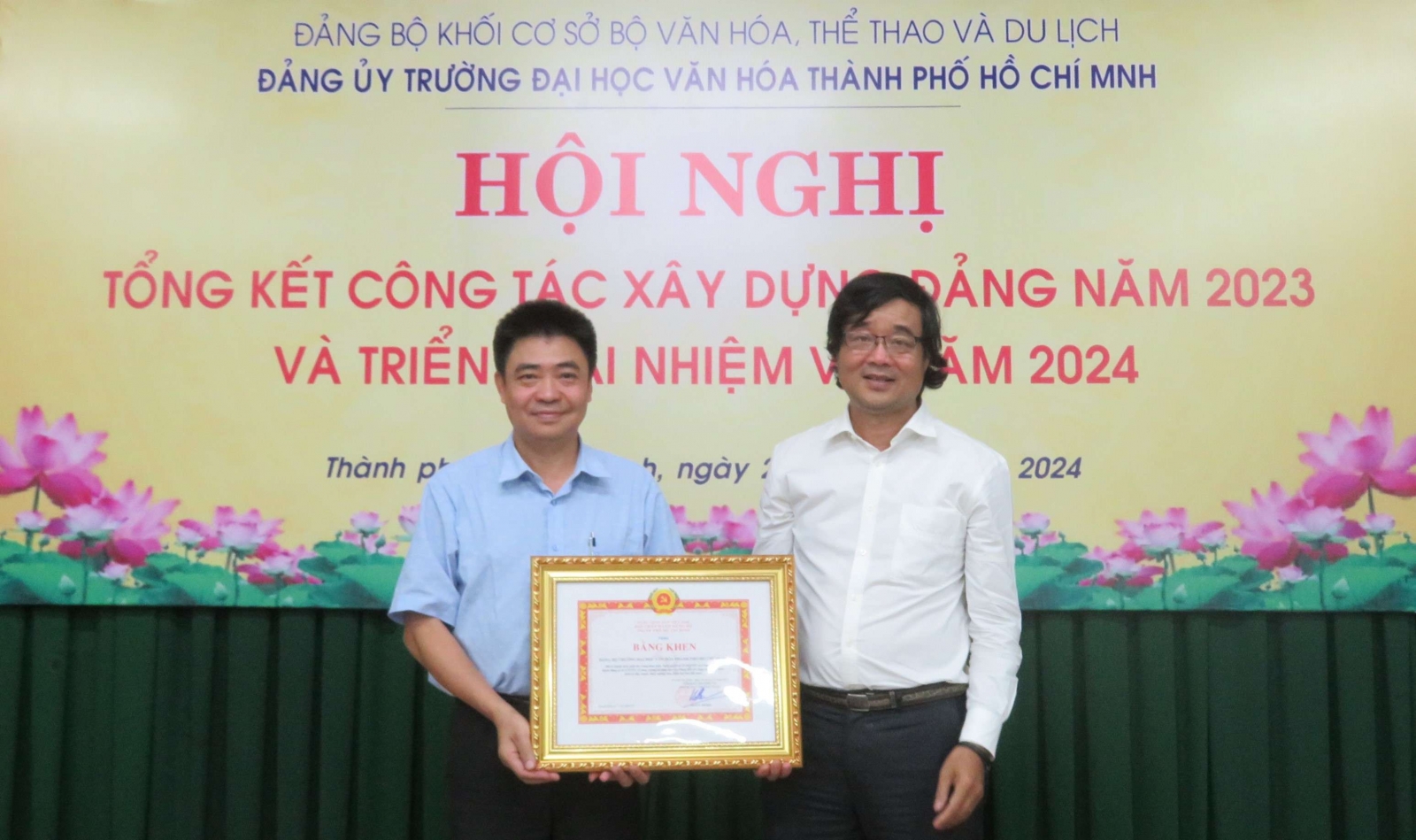 Đ/c Lương Văn Nhiền, Bí thư Đảng ủy Khối cơ sở Bộ Văn hóa, Thể thao và Du lịch trao tặng Bằng khen của Thành ủy Thành phố Hồ Chí Minh cho Đảng bộ Trường Đại học Văn hóa Thành phố Hồ Chí Minh.