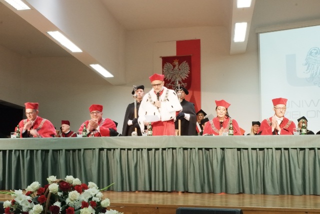 Ban Giám hiệu Trường Đại học Tổng hợp Zielona Góra chủ trì Lễ khai giảng năm học 2018 - 2019. Phía sau là các thành viên Hội đồng trường của Trường Đại học Tổng hợp Zielona Góra. Ảnh: NTD.