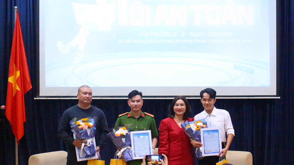 Một trong những điểm nhấn của chương trình là phần trình chiếu phim tài liệu phản ánh thực trạng các đường dây lừa đảo xuyên biên giới với những chiêu trò “việc nhẹ lương cao”. Những hình ảnh chân thực, giàu tính cảnh báo đã giúp người xem nhận diện rõ hơn những cạm bẫy tinh vi trên không gian mạng hiện nay. Trong phần giao lưu, chia sẻ các khách mời gồm: Đại úy Nguyễn Anh Quân (Phòng Cảnh sát hình sự Thành phố), đạo diễn Nguyên Phương đã mang đến nhiều thông tin hữu ích và góc nhìn thực tế. Các diễn giả đã phân tích các thủ đoạn lừa đảo công nghệ cao, đồng thời đưa ra những lời khuyên thiết thực giúp sinh viên nâng cao cảnh giác và kỹ năng tự bảo vệ bản thân khi tham gia môi trường số.